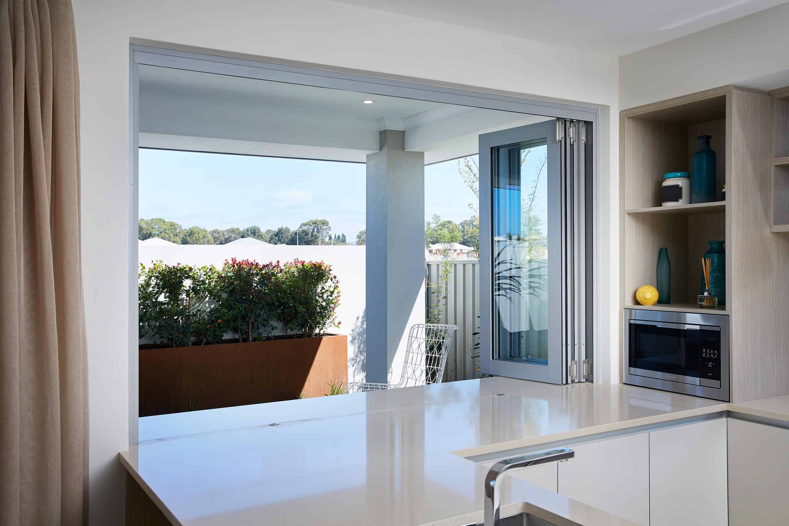 The Carinya Select Top and Bottom Bi-Fold System features flat sill options for smooth accessibility and optional mid rails with multi-point locking in a range of opening configurations.