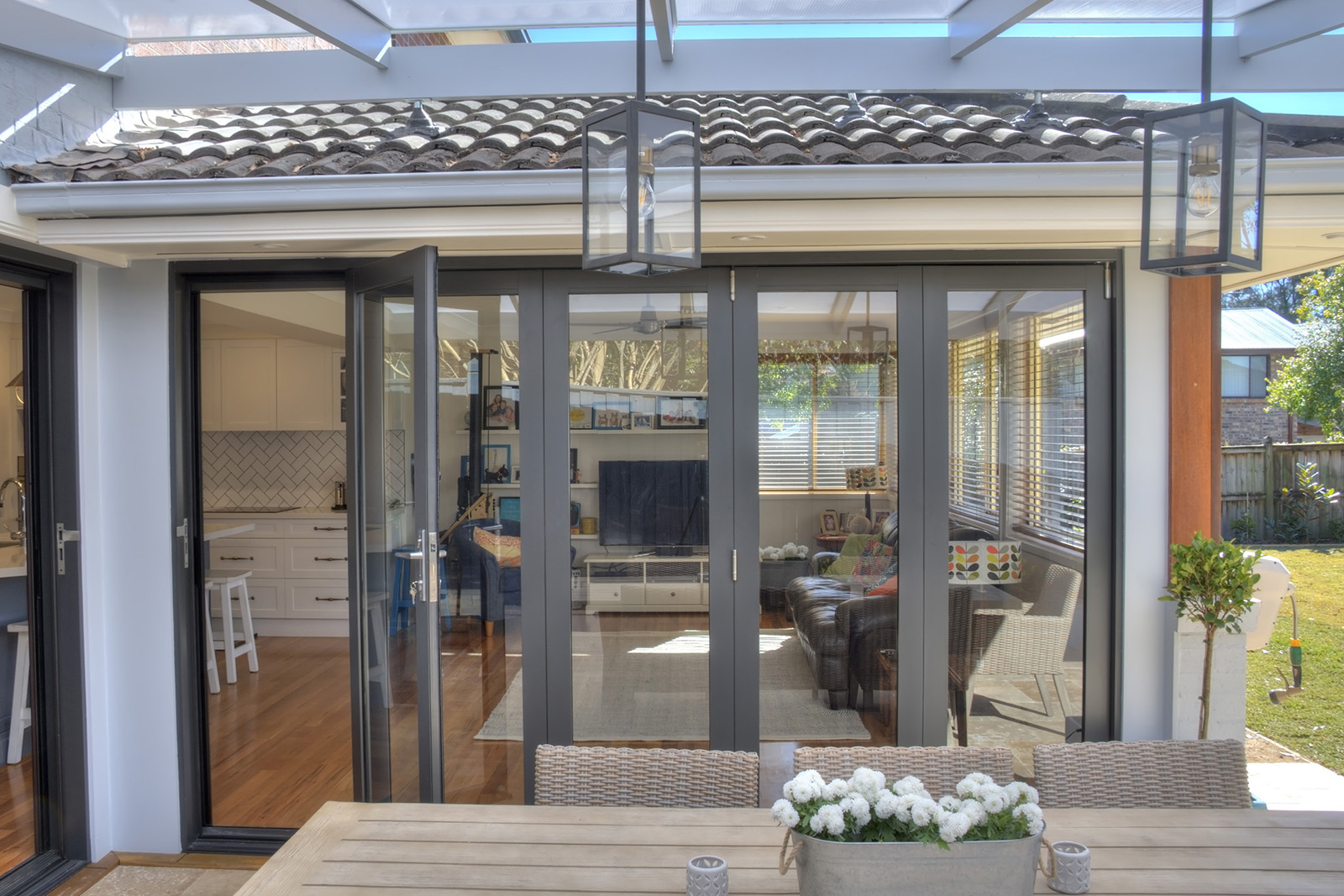 The Bottom rolling Bi-Fold system features the innovative F2/F3 Centor Bottom rolling hardware which overcomes the requirement for any structural beam as needed in a top hung Bi Fold system. This is ideal for the new or renovation market that want an Alfresco style opening without the additional cost of a structural beam.