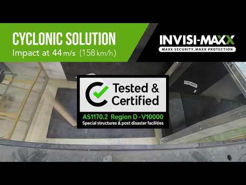 Under Australian Standards, screens must be independently tested to exceed the performance requirements for cyclone regions C and D to achieve cyclone compliance. While Australian Standards require screens in extreme cyclonic regions (region D) to resist impacts from debris travelling at 35.2 m/sec, Invisi-Maxx screens have been demonstrated under NATA-certified testing to withstand projectiles up to 44m/sec.