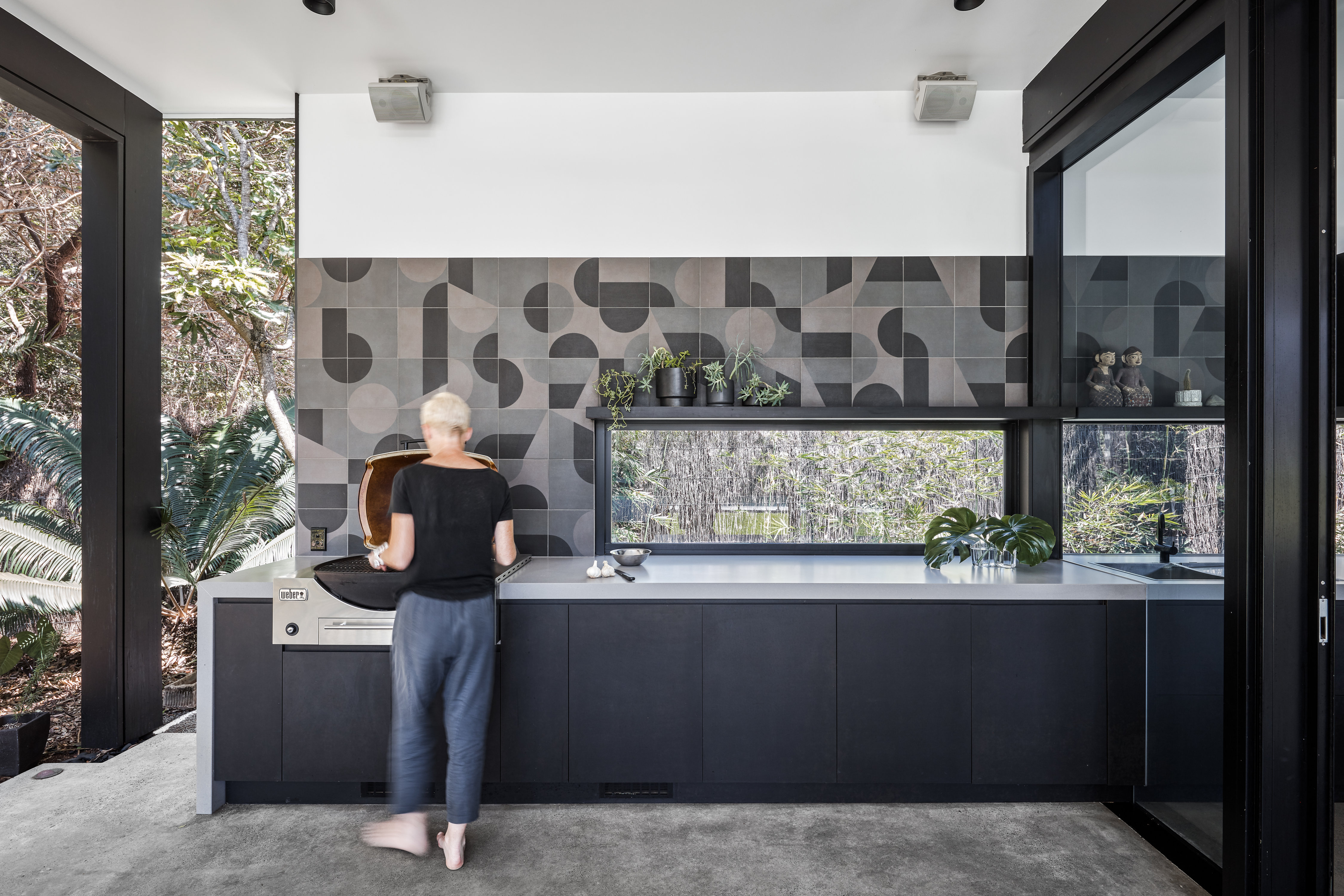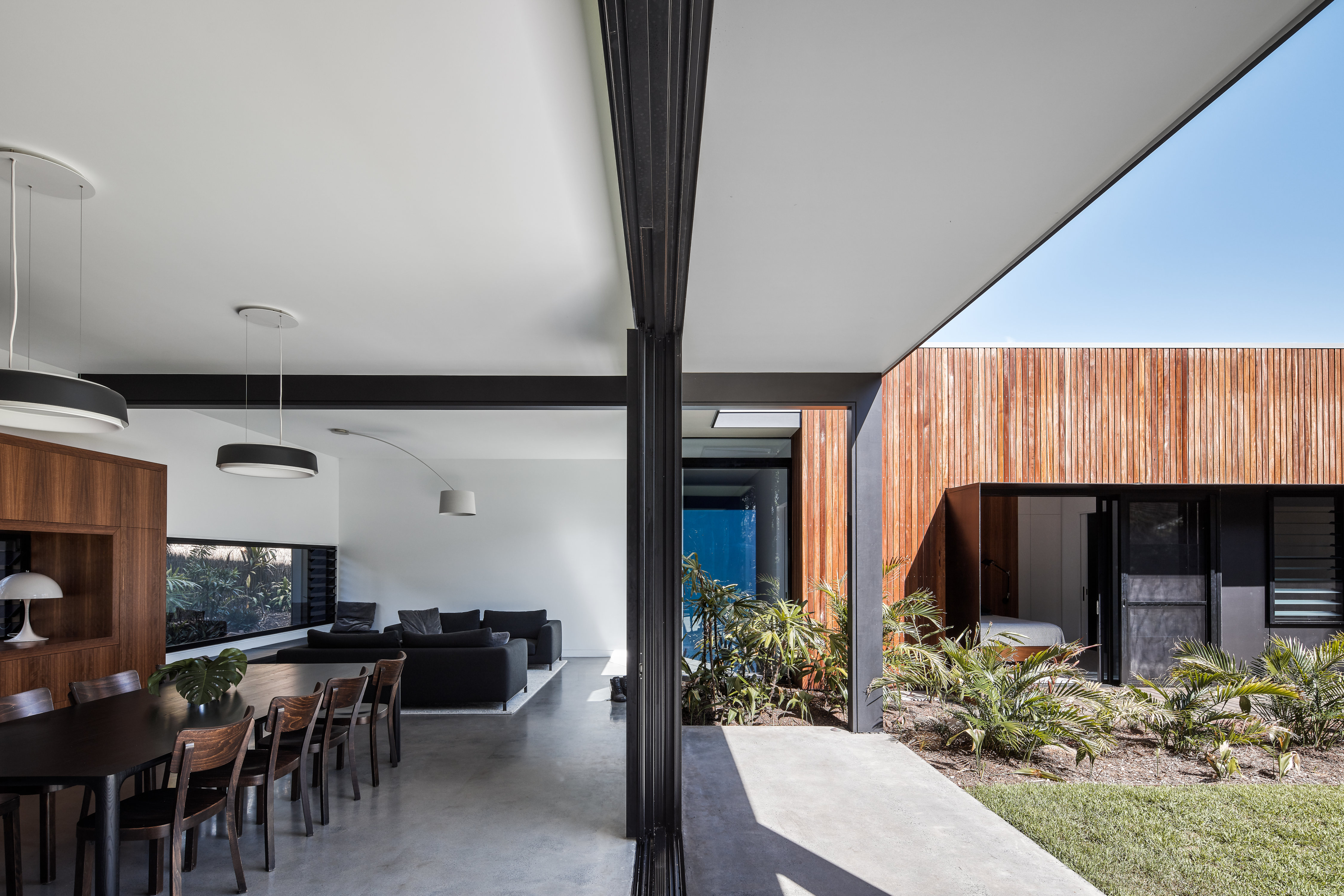 With their contrasting Dulux Zeus Black finish, the Alspec framing products selected for this home provide a striking accent to the cool concrete and warm wood features, delivering a stylish, low maintenance home from which the family can enjoy the idyllic beachside location.