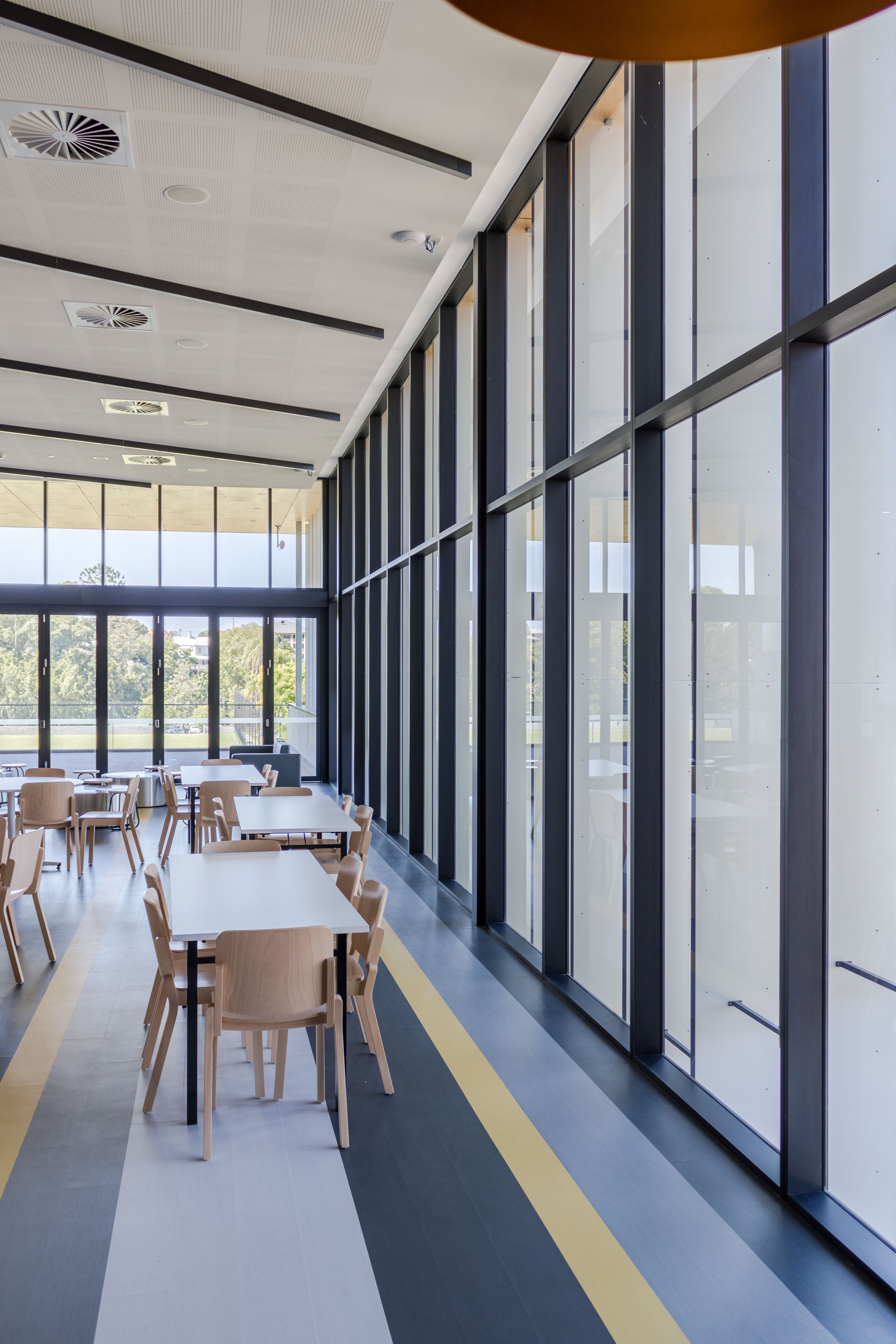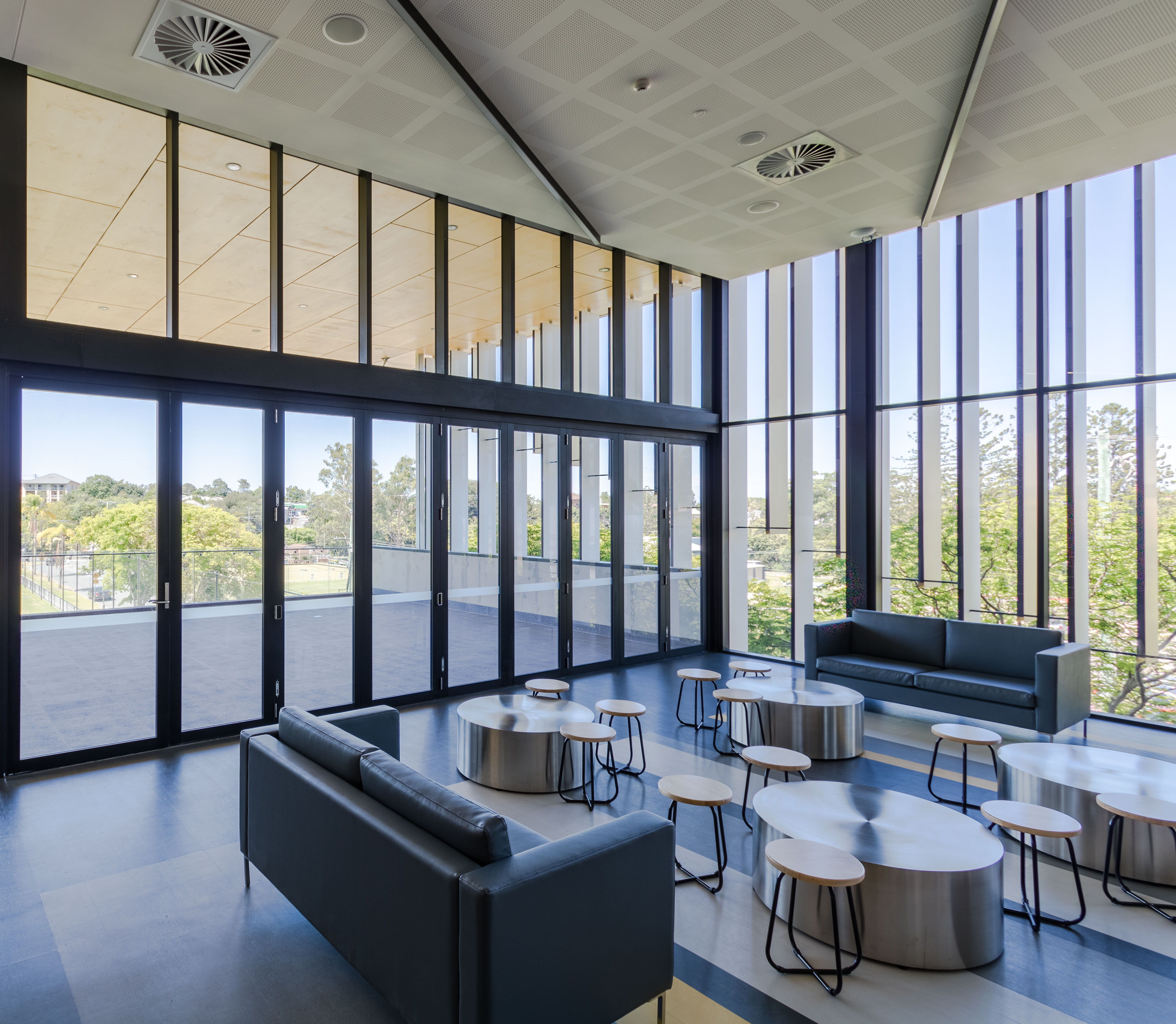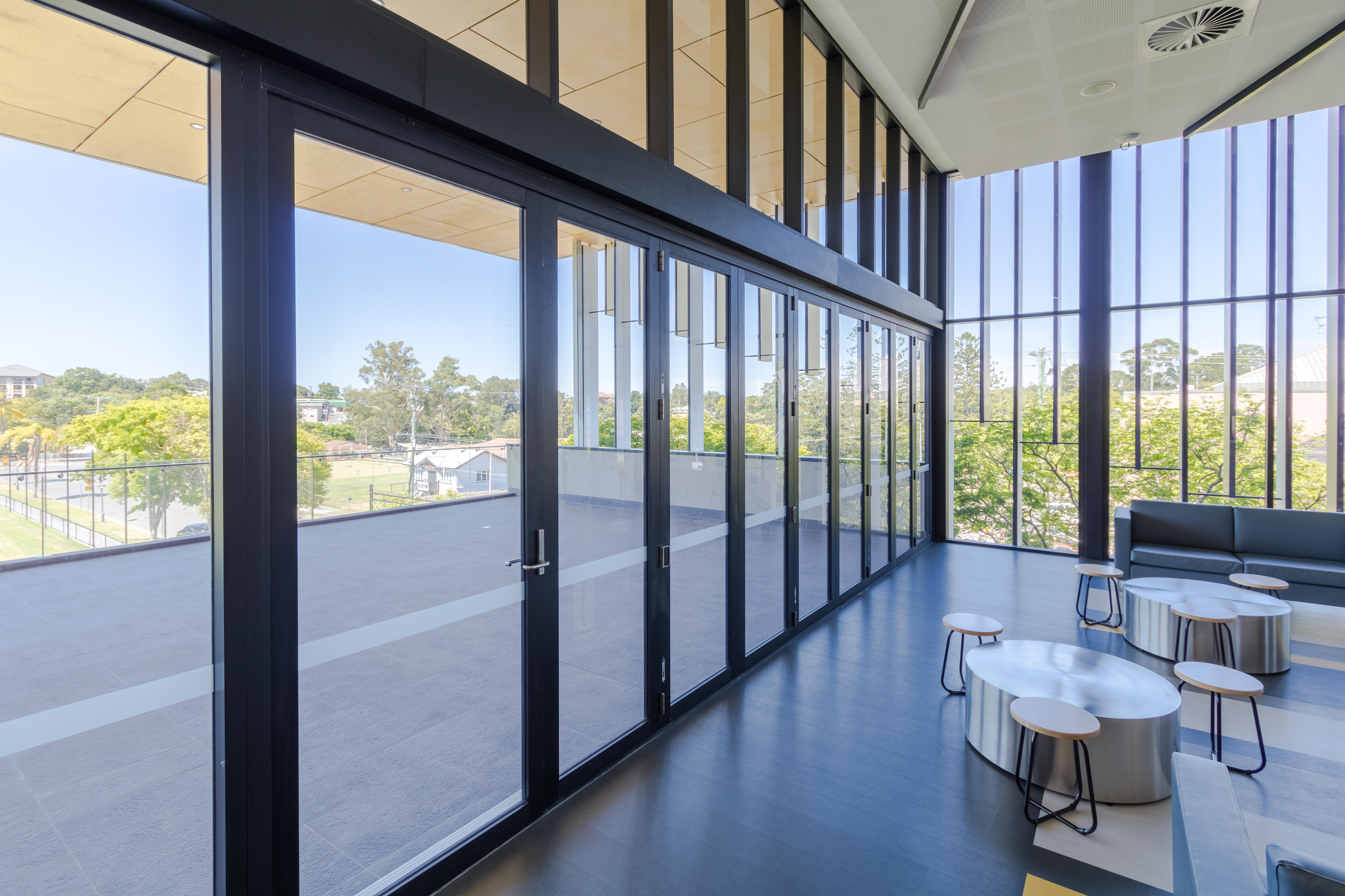 In selecting doors for the facility, products from the ProGlide and Hawkesbury ranges were determined as best suited to provide access to the outdoor deck and balcony areas. For example, on the ground floor a dining area is adjacent to a large exterior balcony. In this case, 2.9m high ProGlide High Performance Sliding Doors were used in conjunction with the AD775 ProGlide Plant on Track to span one opening of 4.9m and a second opening of 3.2m. Meanwhile, the viewing deck on Level “1.5” (halfway between levels 1 and 2), can be completely integrated with the interior via Hawkesbury Commercial Multi Fold Doors. Installed in a nine panel configuration, the 2.7m high doors operate effortlessly over the 7.6m opening due to their top-rolling system and concealed floor guides.