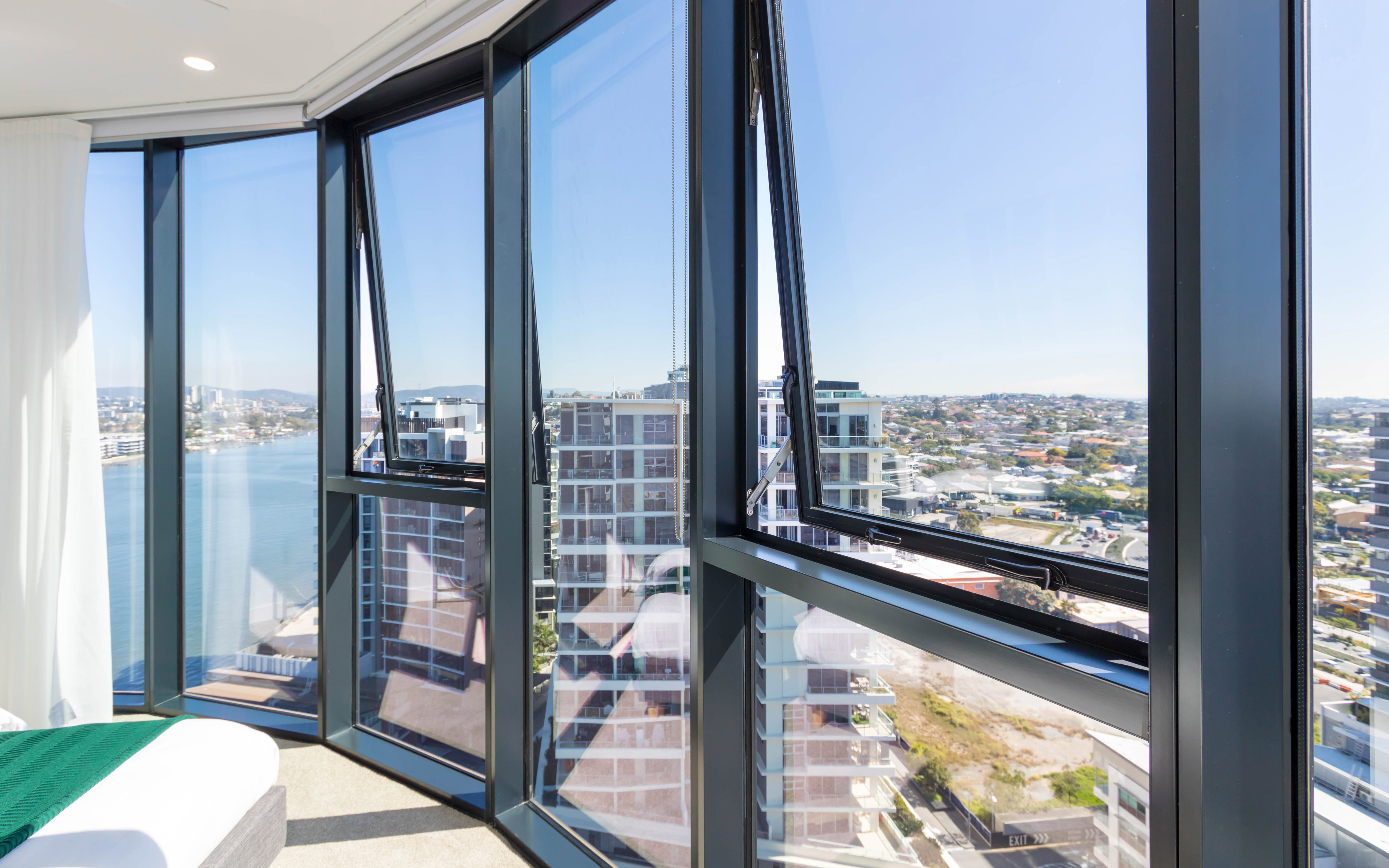 Meanwhile Hunter Evo 150 Double Flush Glazed Framing was used for the portions of fixed window framing, providing the benefits of double-glazing for the building’s urban environment, adjacent to the Portside Wharf commercial complex. In addition the Hunter Evo framing presents architecturally pleasing sharp unbroken lines, supported by excellent all-weather performance credentials.