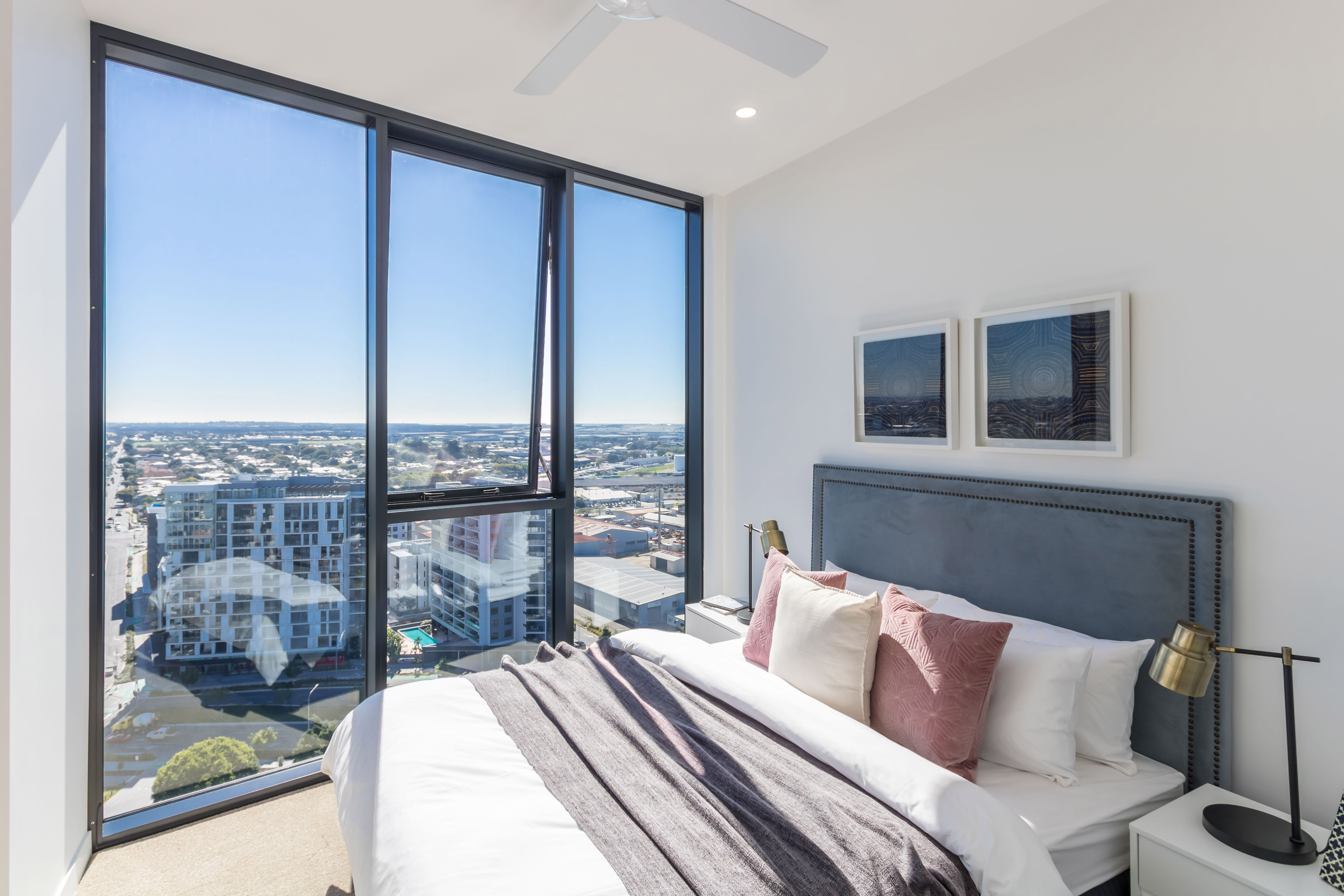 Gentle curved balconies, high ceilings and expansive glazing deliver spectacular riverfront living at these art-themed apartments.