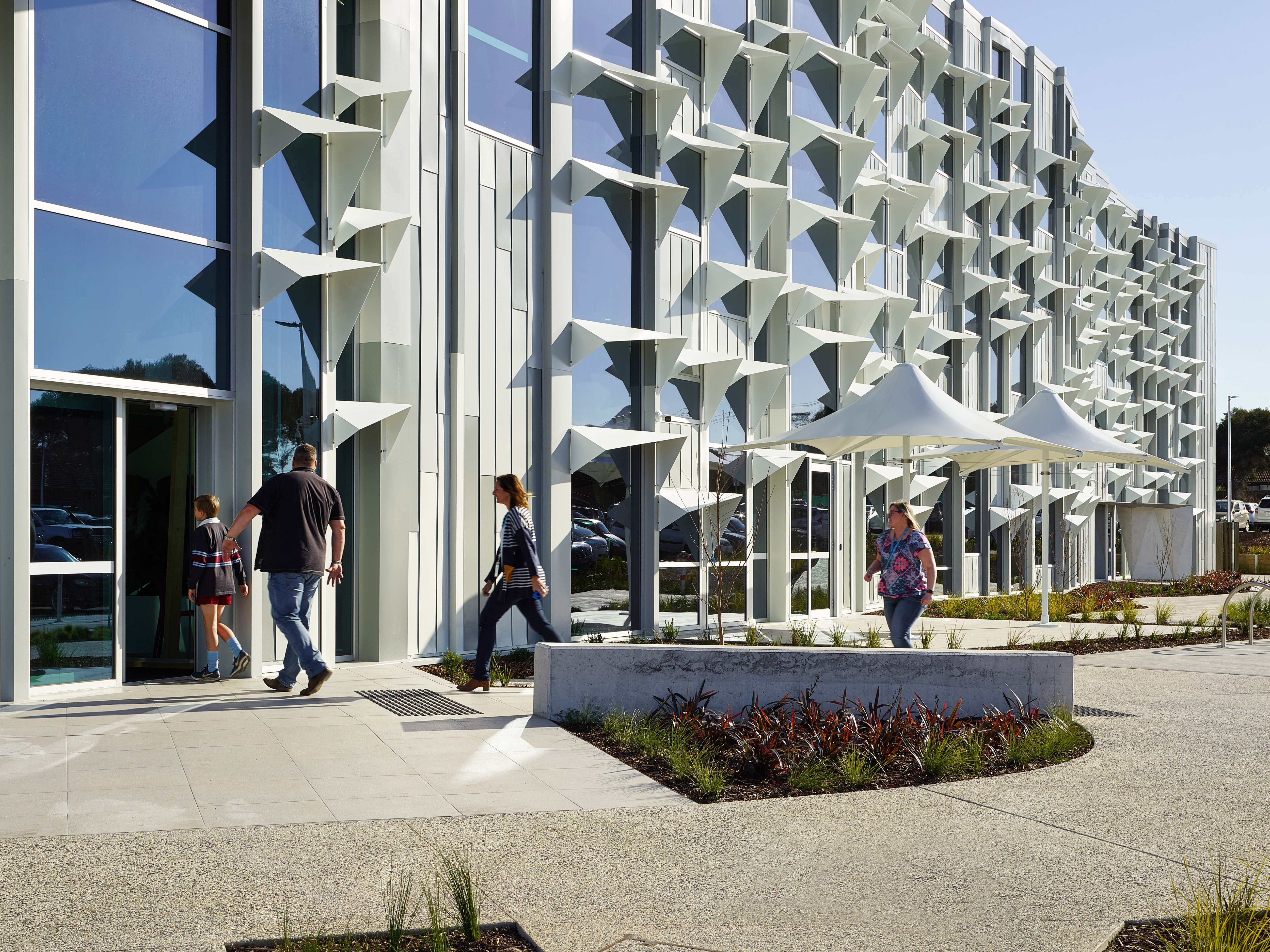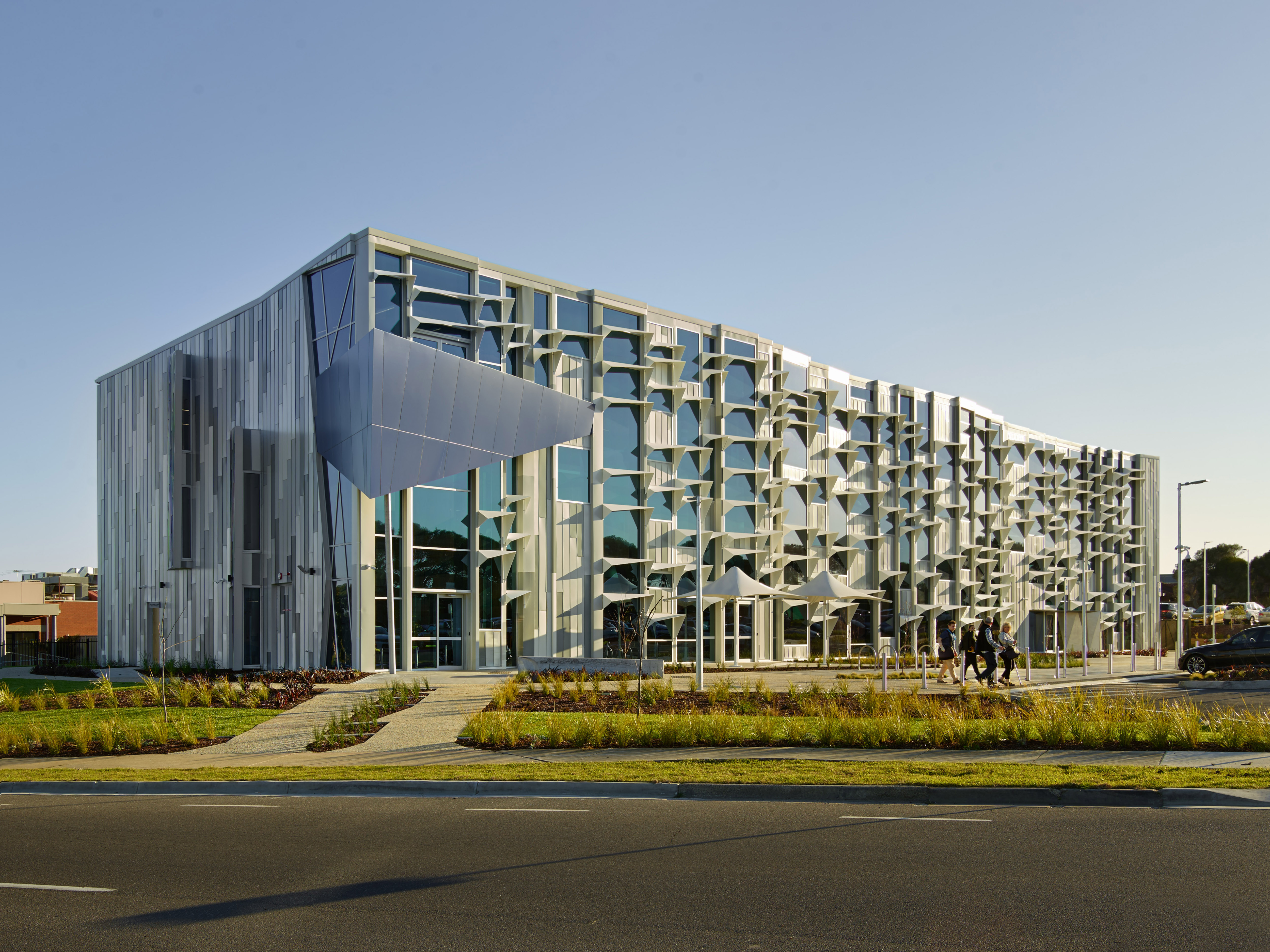 The geometrically styled façade was created with Alspec LV121 fixed louvres, added as “light shelves” above the north facing windows. The angled three-sided shelves reduce heat and glare impacts through the windows, ensuring better building performance and more stable interior temperatures. Fixed louvres can be installed in multiple blade shapes and sizes, and can be powder coated or given an anodised finish as required to match a building’s aesthetics.