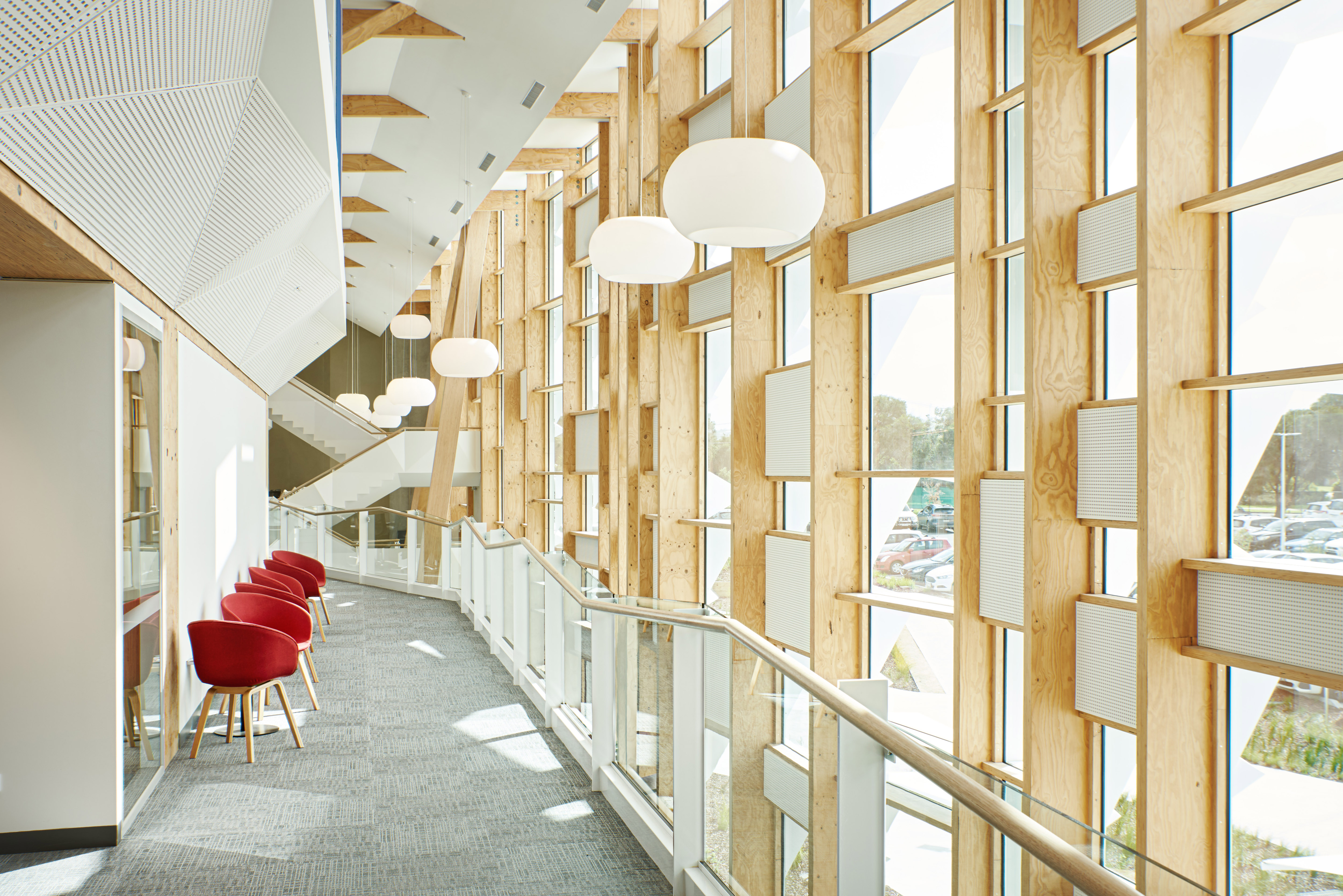 Light airy spaces, high ceilings and cleverly shielded glazing have created an appealing and environmentally friendly new head office for staff and clients of genU Karingal St Laurence in Belmont, Victoria. The striking three storey building is the new home to 300 staff of genU, an organisation which provides services related to disability, aged care and employment.