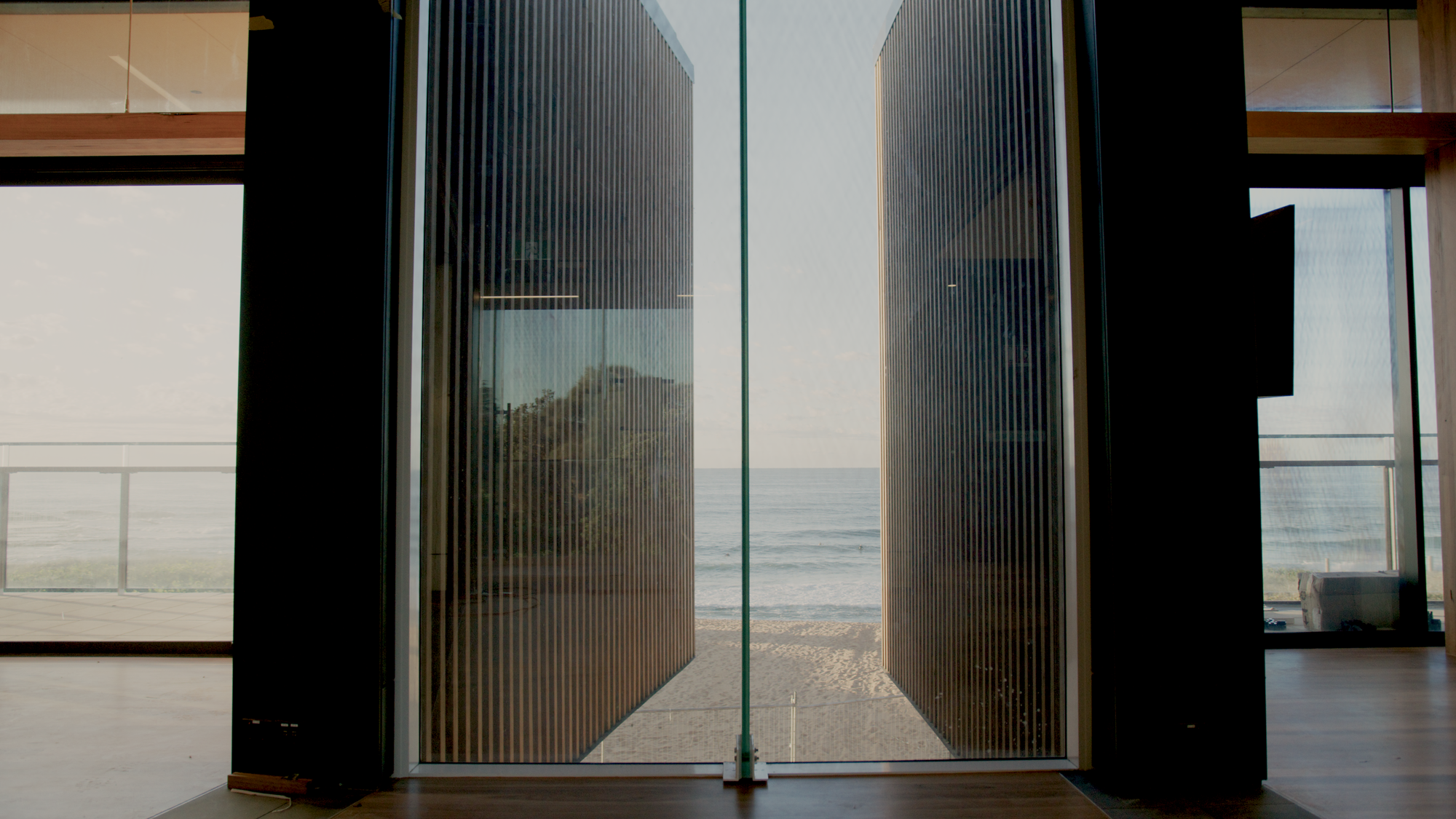 The main building pavilions required large format sliding doors which were easy to operate and would perform well in the seaside environment. Alspec’s ProGlide UltraFlat Sliding Doors met these requirements, with their integrated drainage sills, heavy duty rollers, and tested ability to handle the projected wind loads. The water resistant flush sills are wheelchair compliant, providing a continuous accessible path. The doors for each balcony were configured as three panels stacking in each direction with sections of Hunter Evo 150mm Single Flush Glazed Framing between the doors and the ceilings.