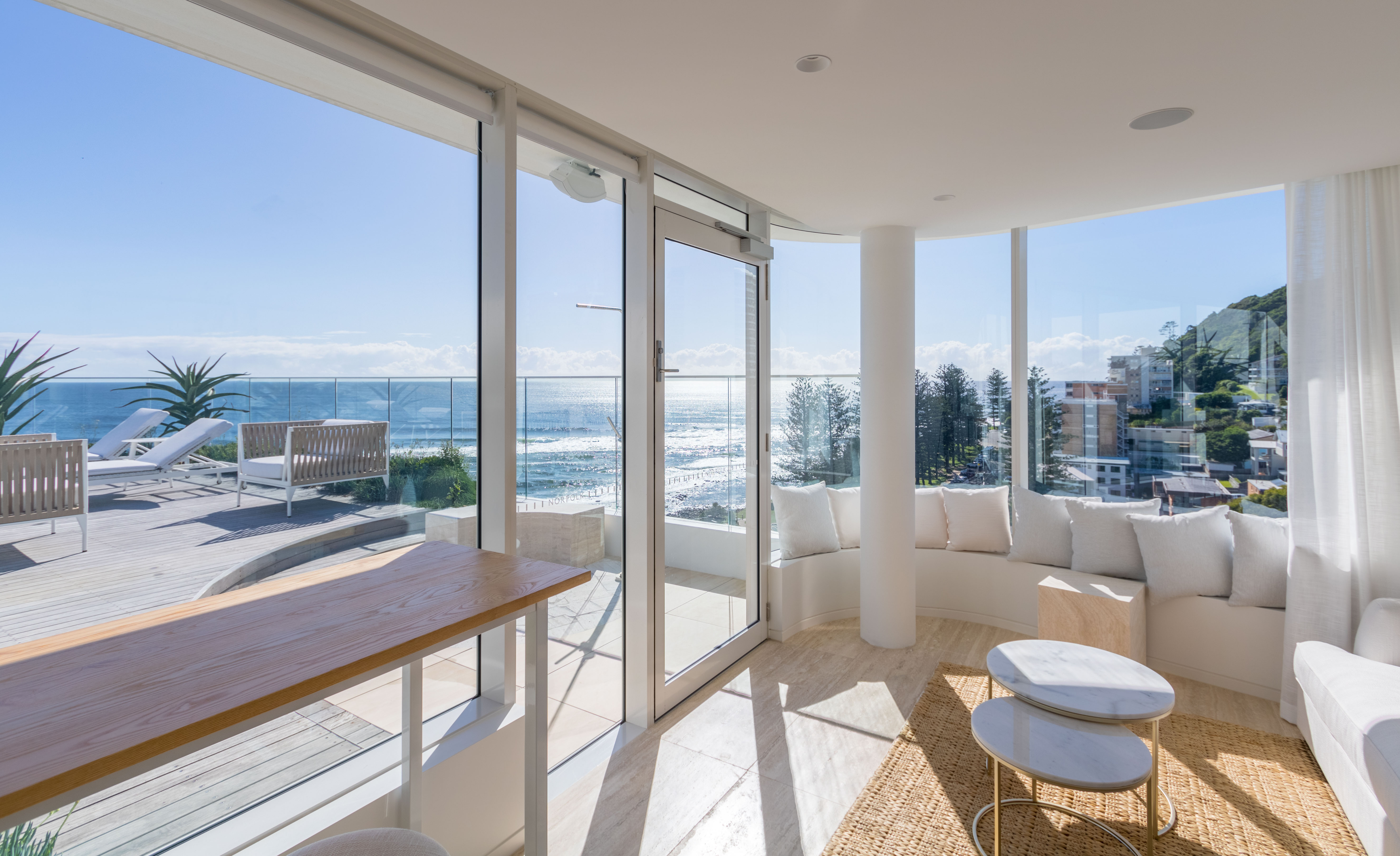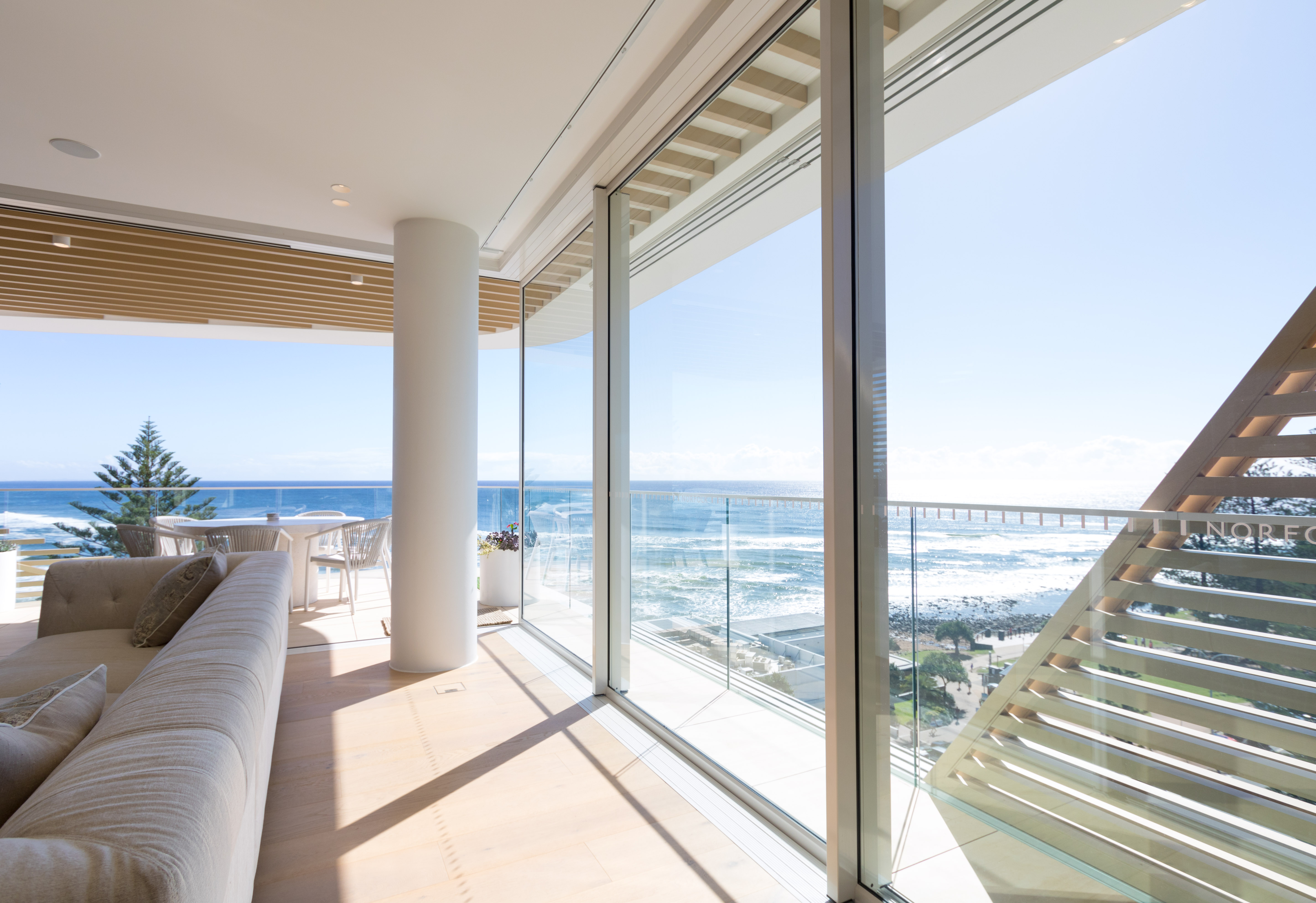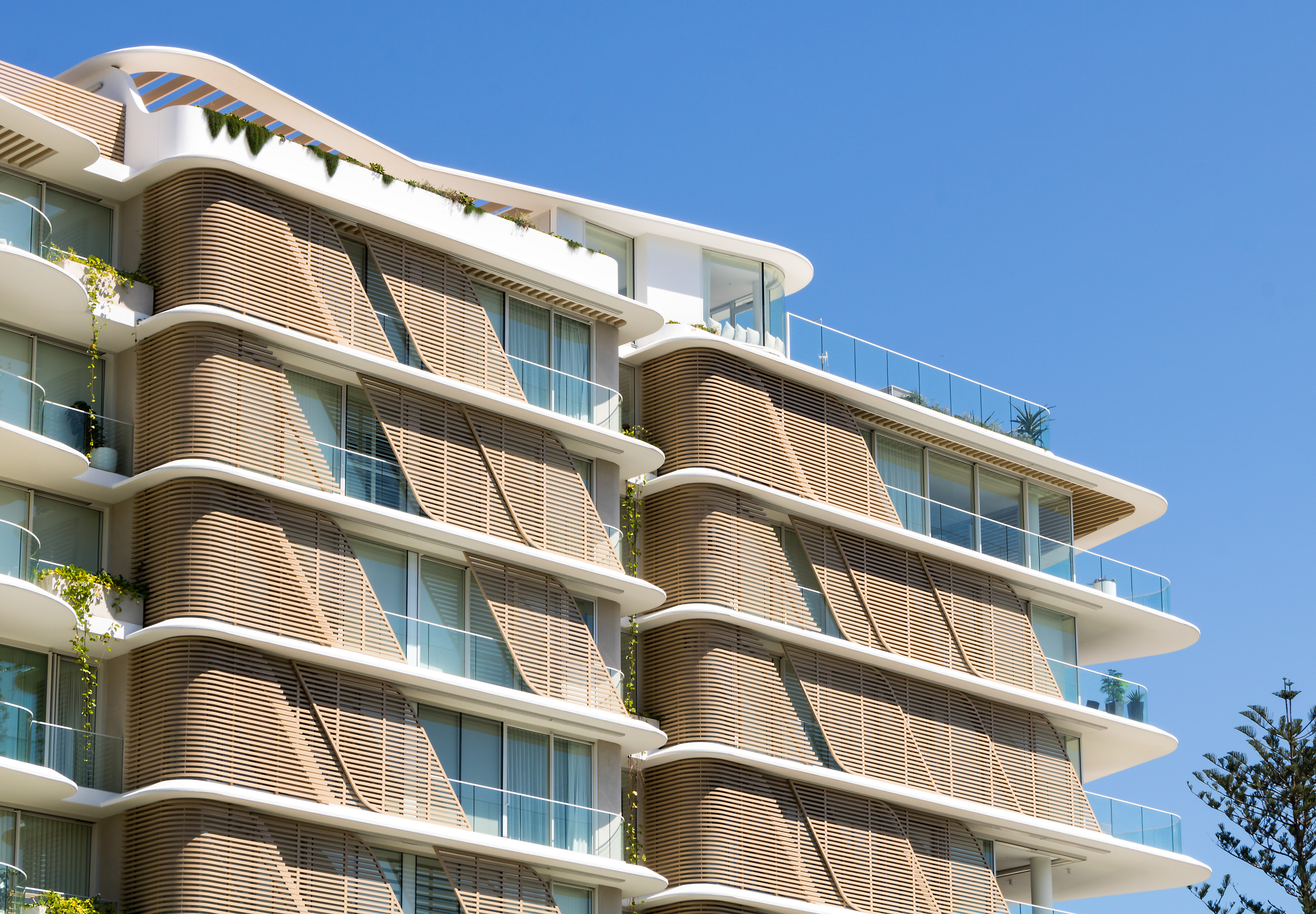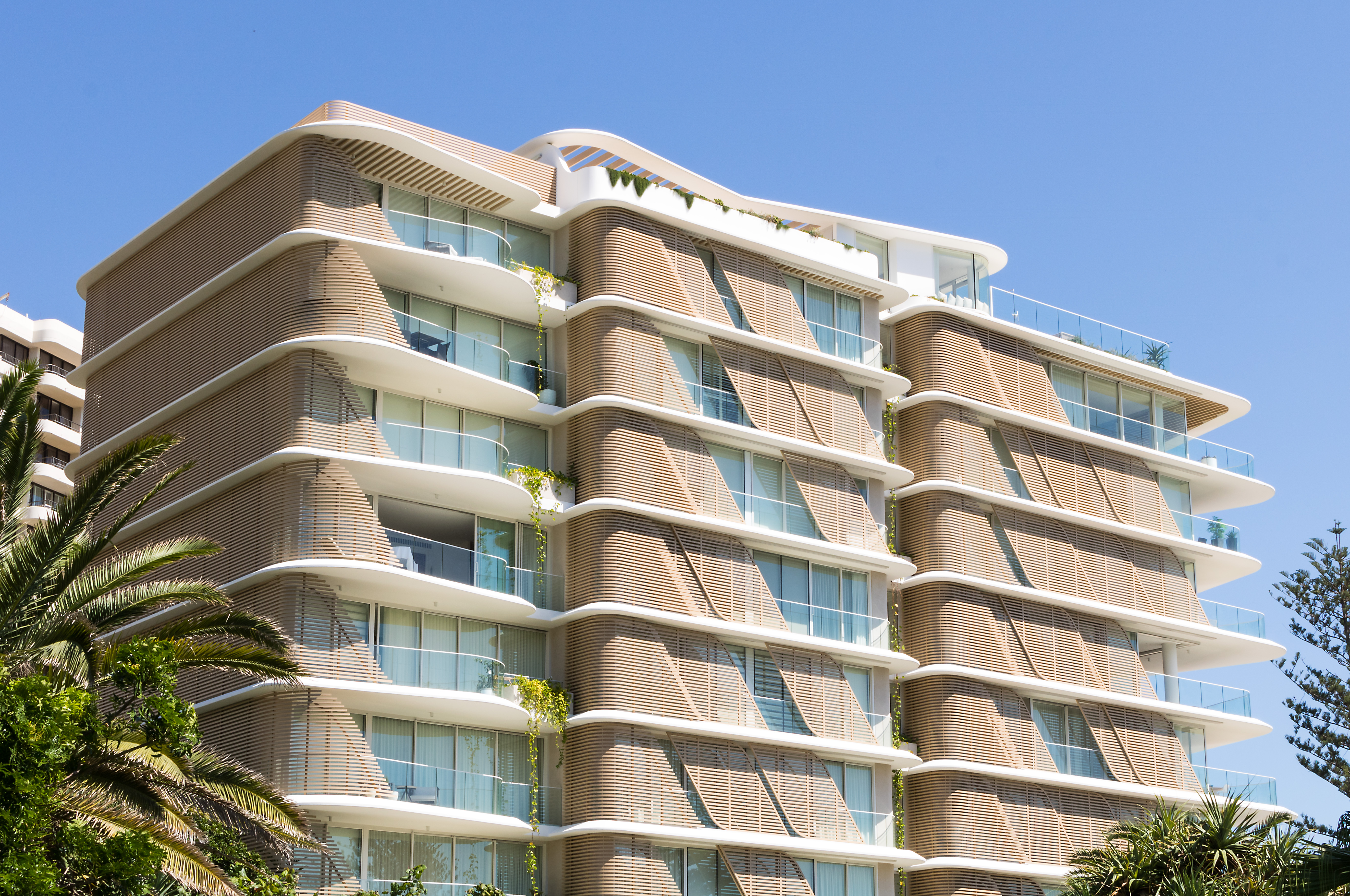 Inspired by the iconic Norfolk pine trees directly opposite the site, architect Koichi Takada designed the building with an “organic” outer shell to harmonise with the surrounding beach landscape while optimising the comfort of the interior spaces. Throughout the development passive design principles have been followed, allowing the building to respond and adapt to seasonal variations.