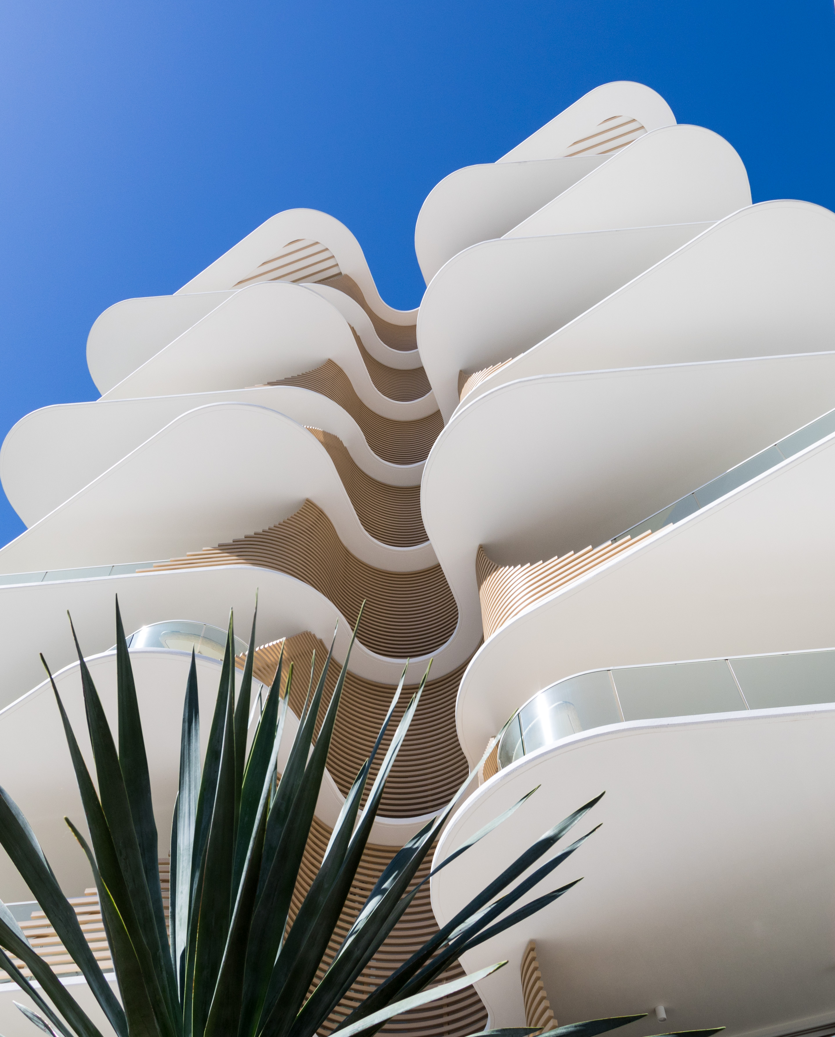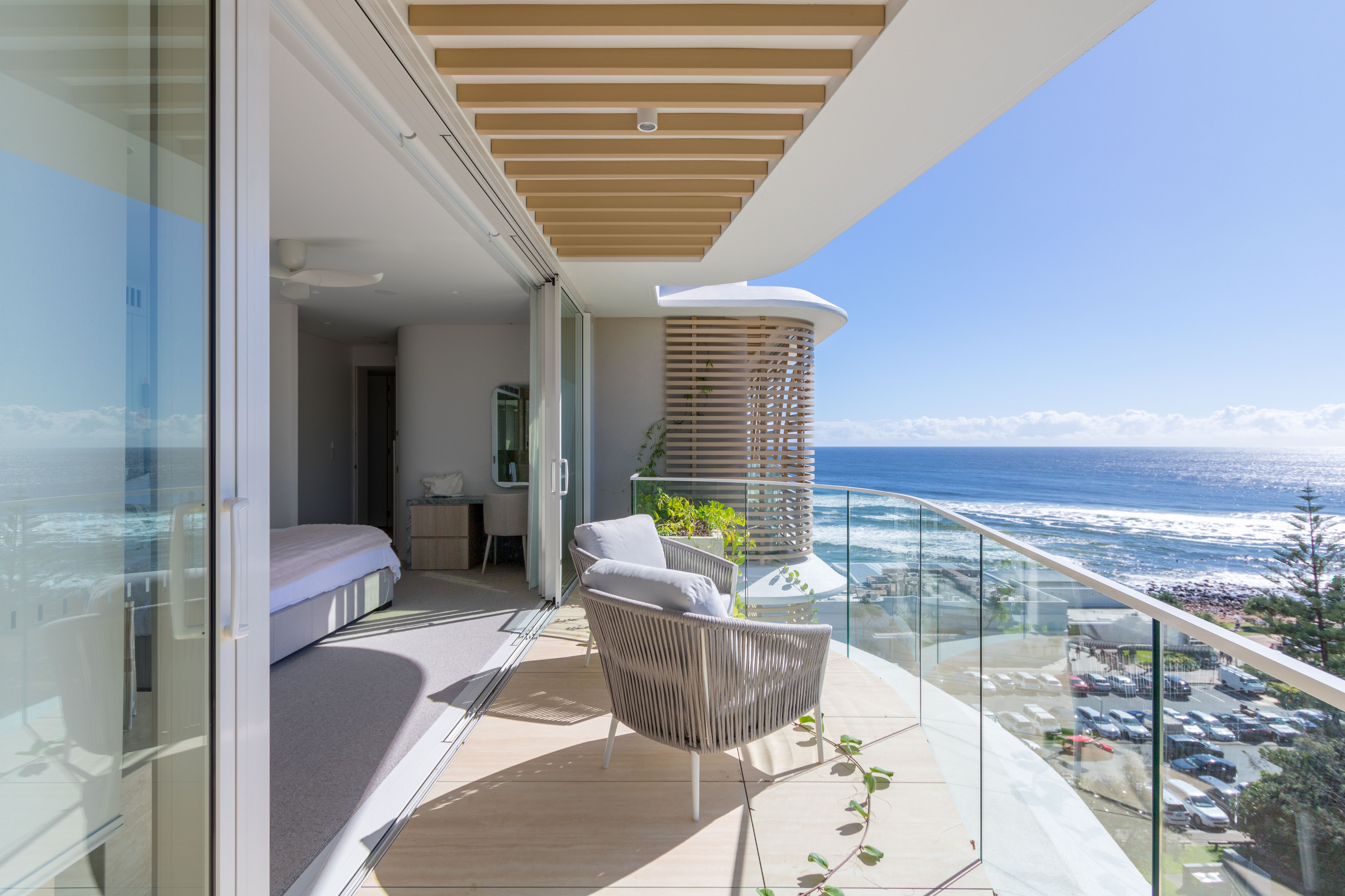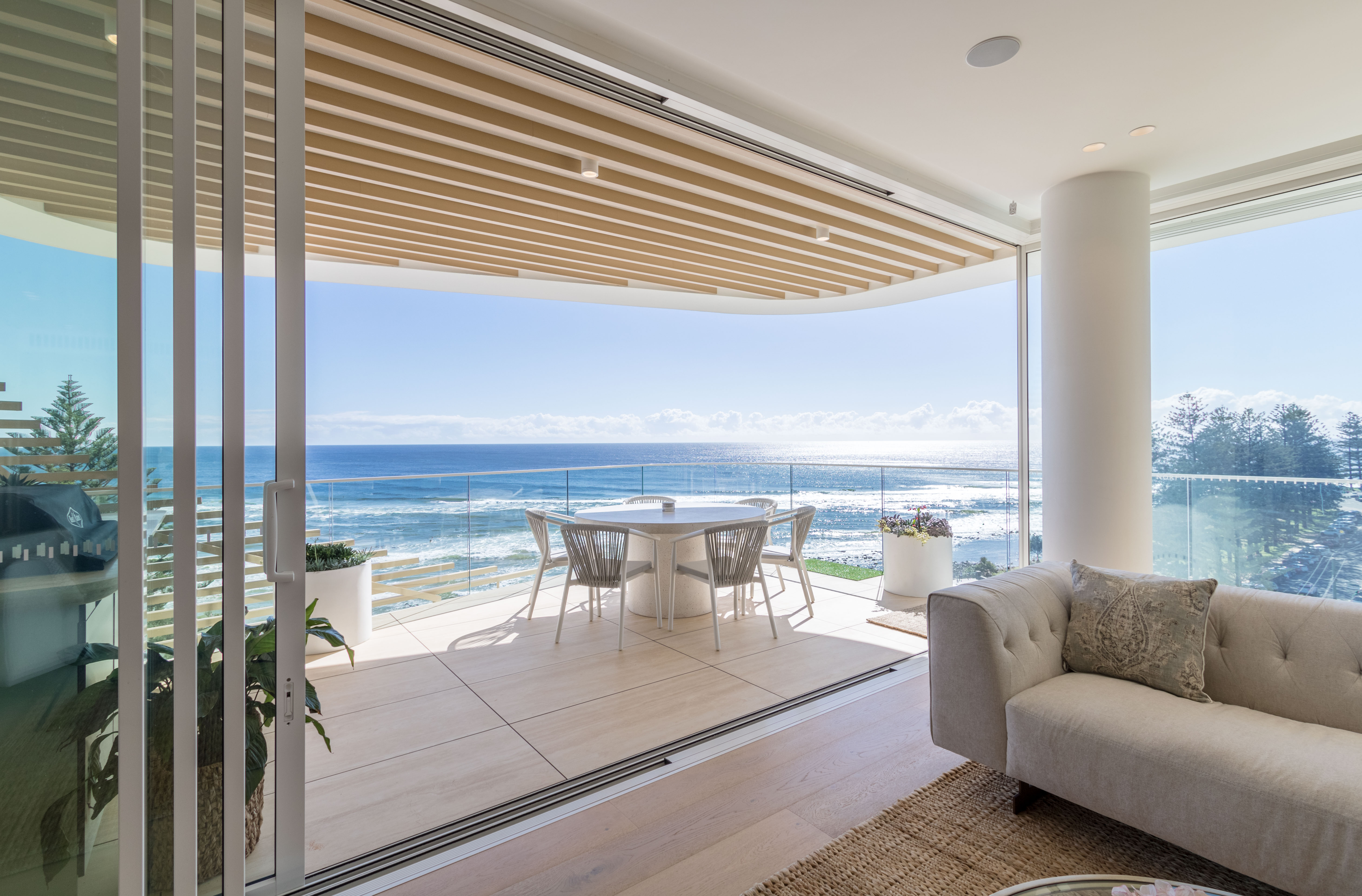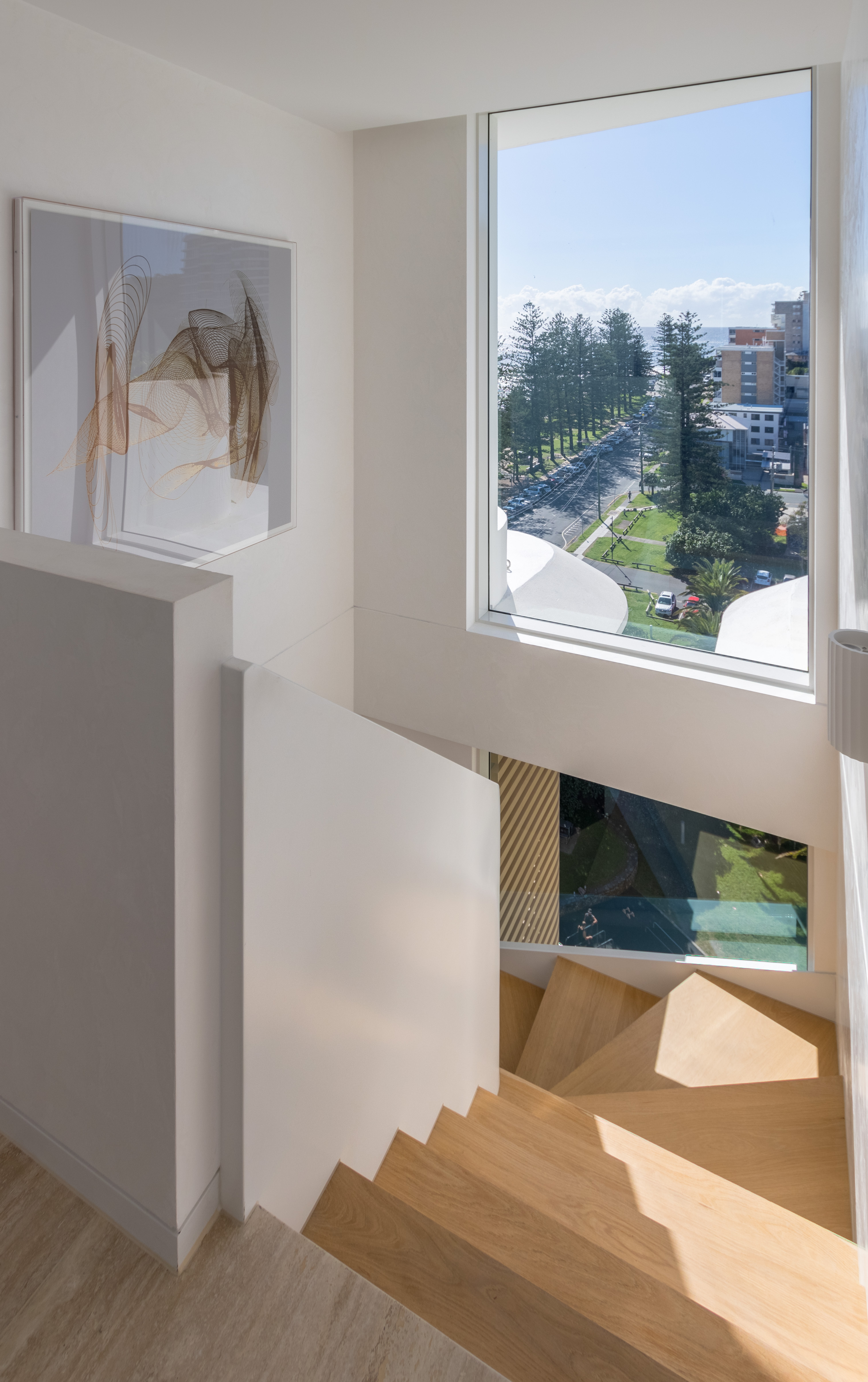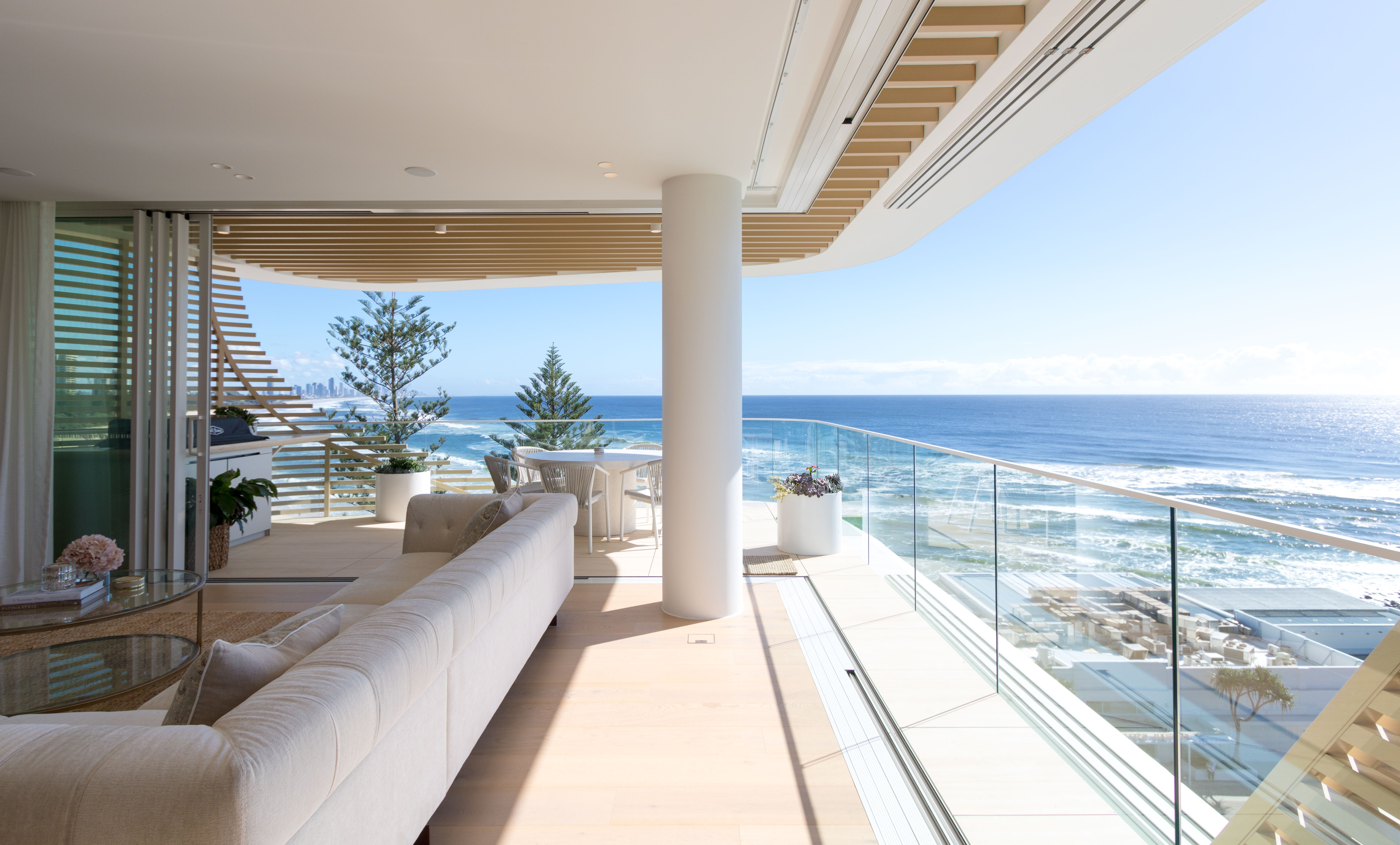 Inspired by the iconic Norfolk pine trees directly opposite the site, architect Koichi Takada designed the building with an “organic” outer shell to harmonise with the surrounding beach landscape while optimising the comfort of the interior spaces. Throughout the development passive design principles have been followed, allowing the building to respond and adapt to seasonal variations.