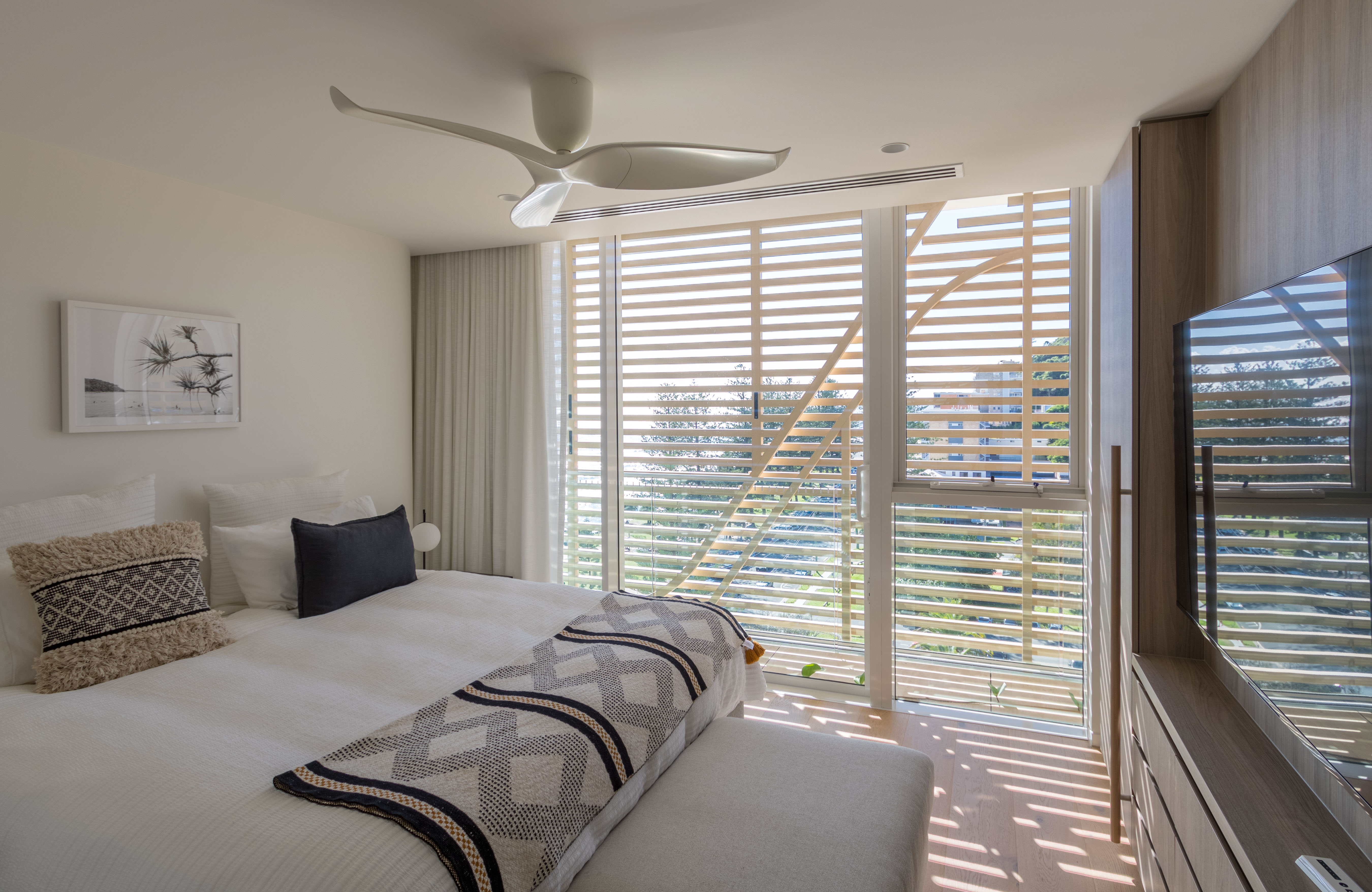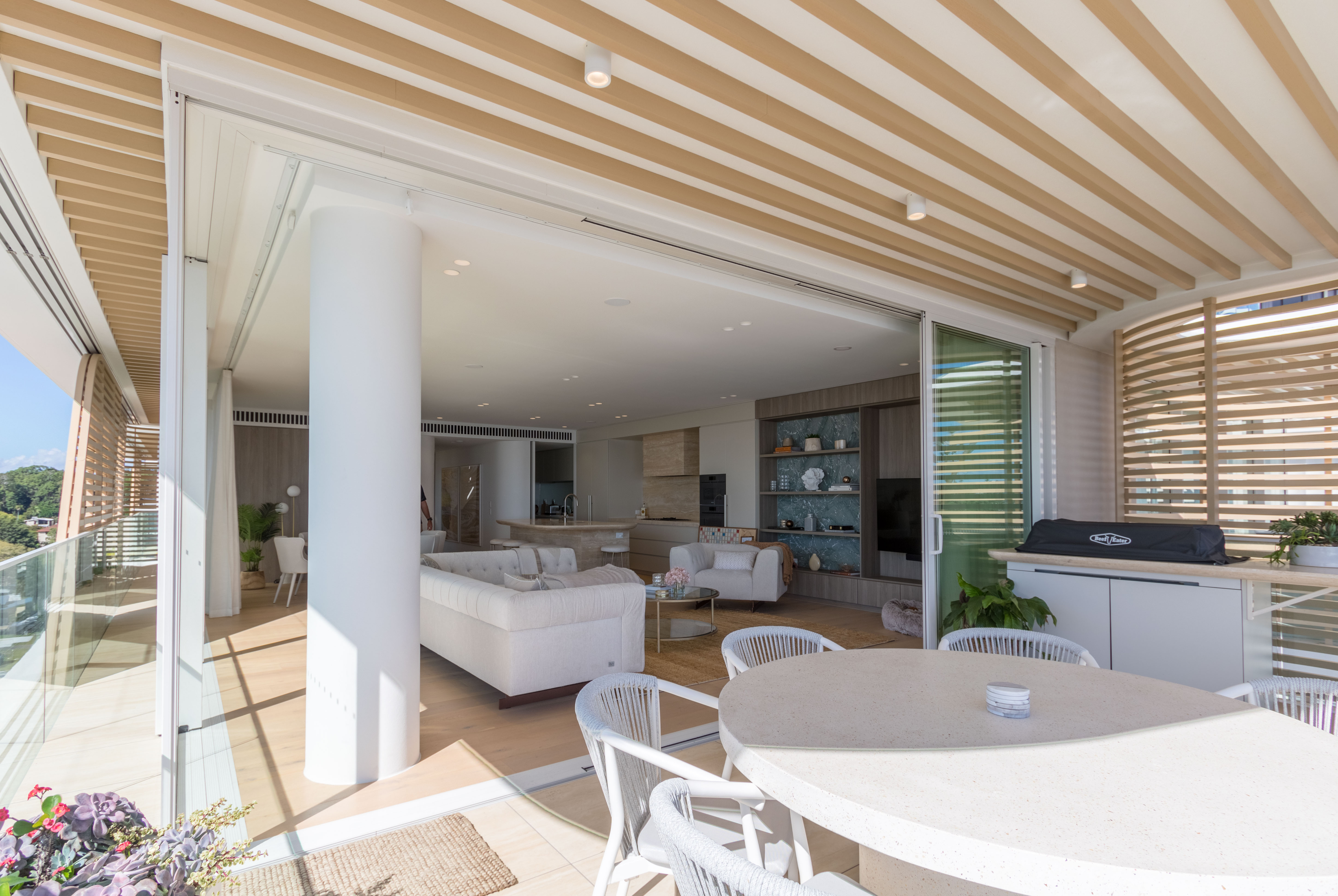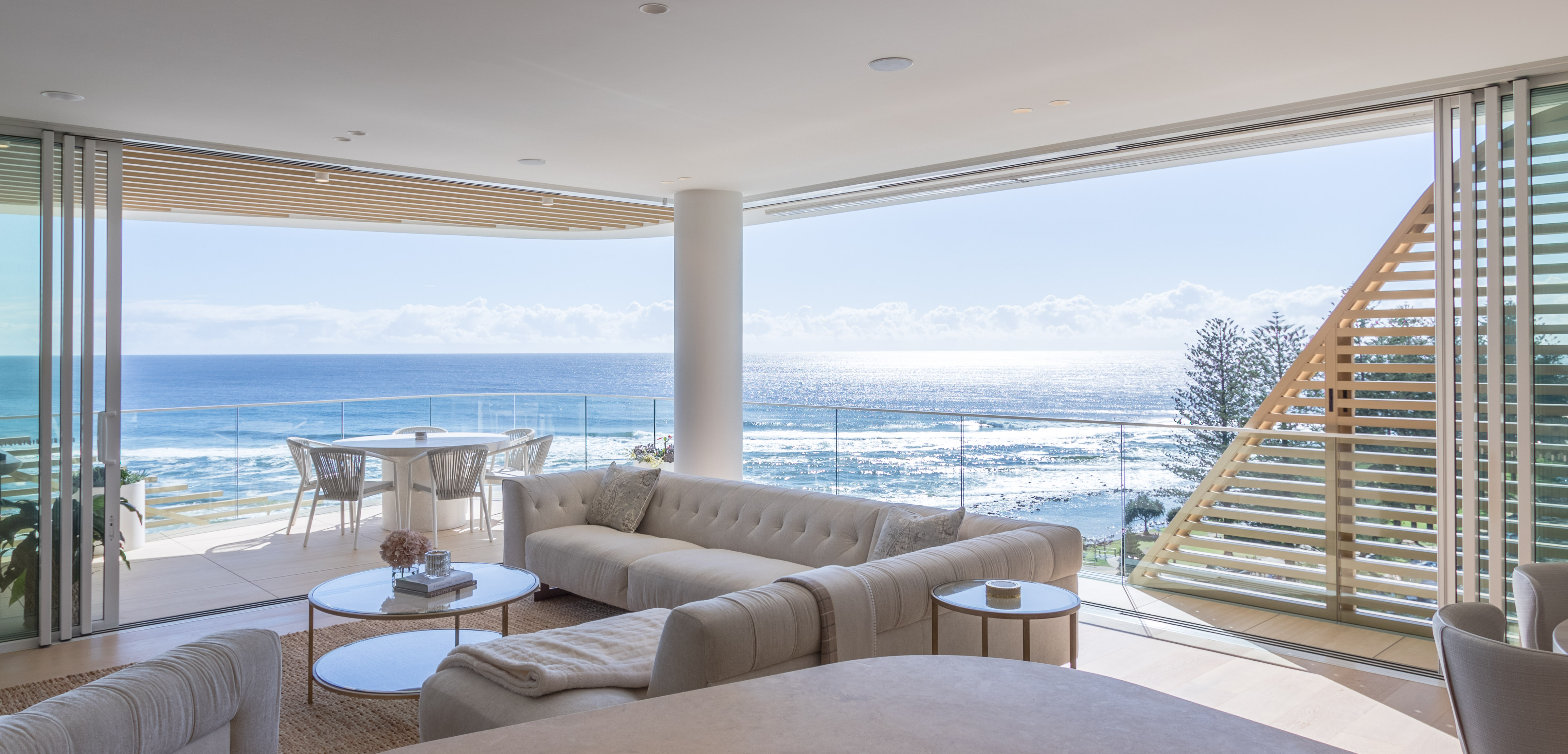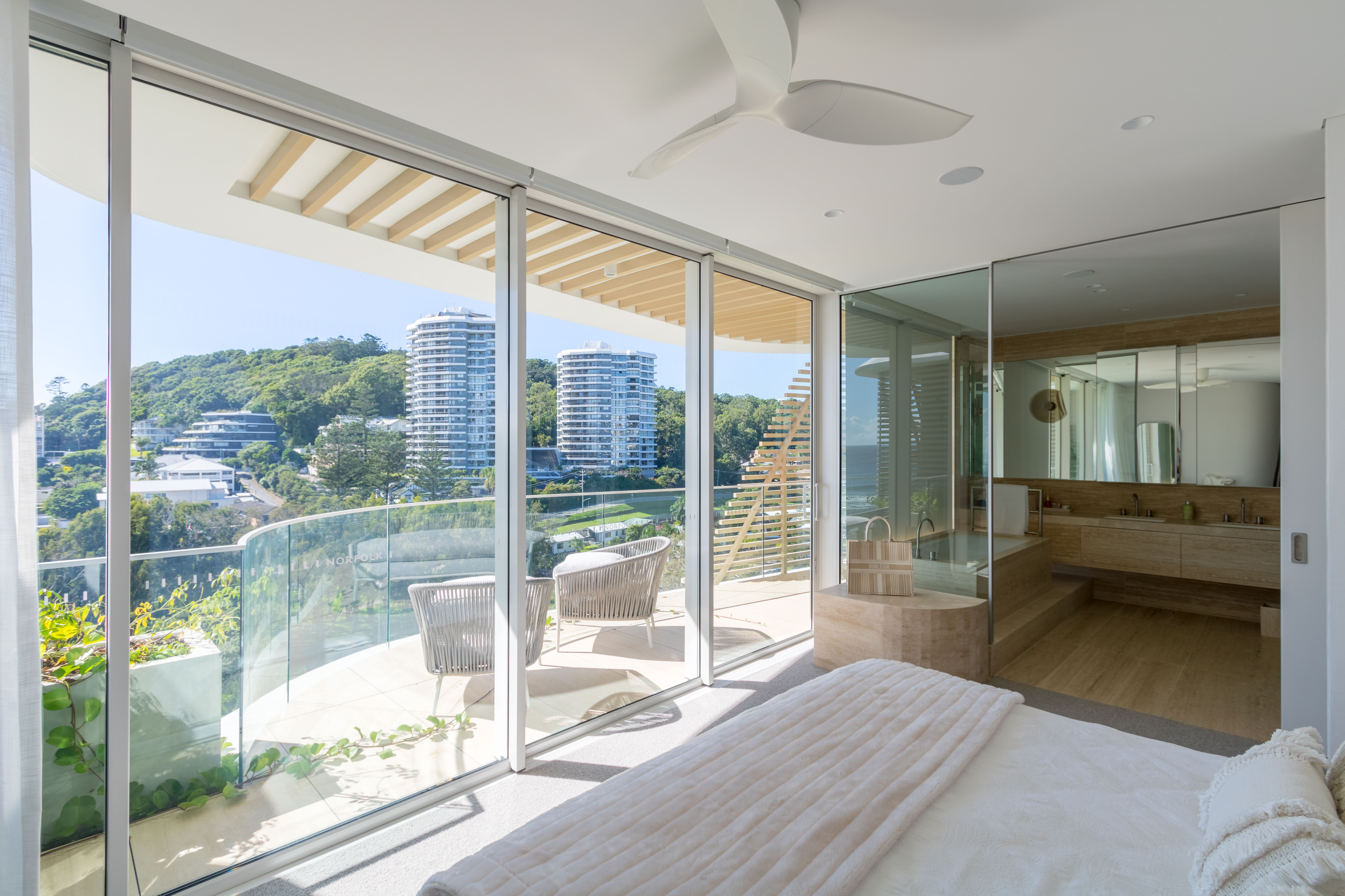 Inspired by the iconic Norfolk pine trees directly opposite the site, architect Koichi Takada designed the building with an “organic” outer shell to harmonise with the surrounding beach landscape while optimising the comfort of the interior spaces. Throughout the development passive design principles have been followed, allowing the building to respond and adapt to seasonal variations.