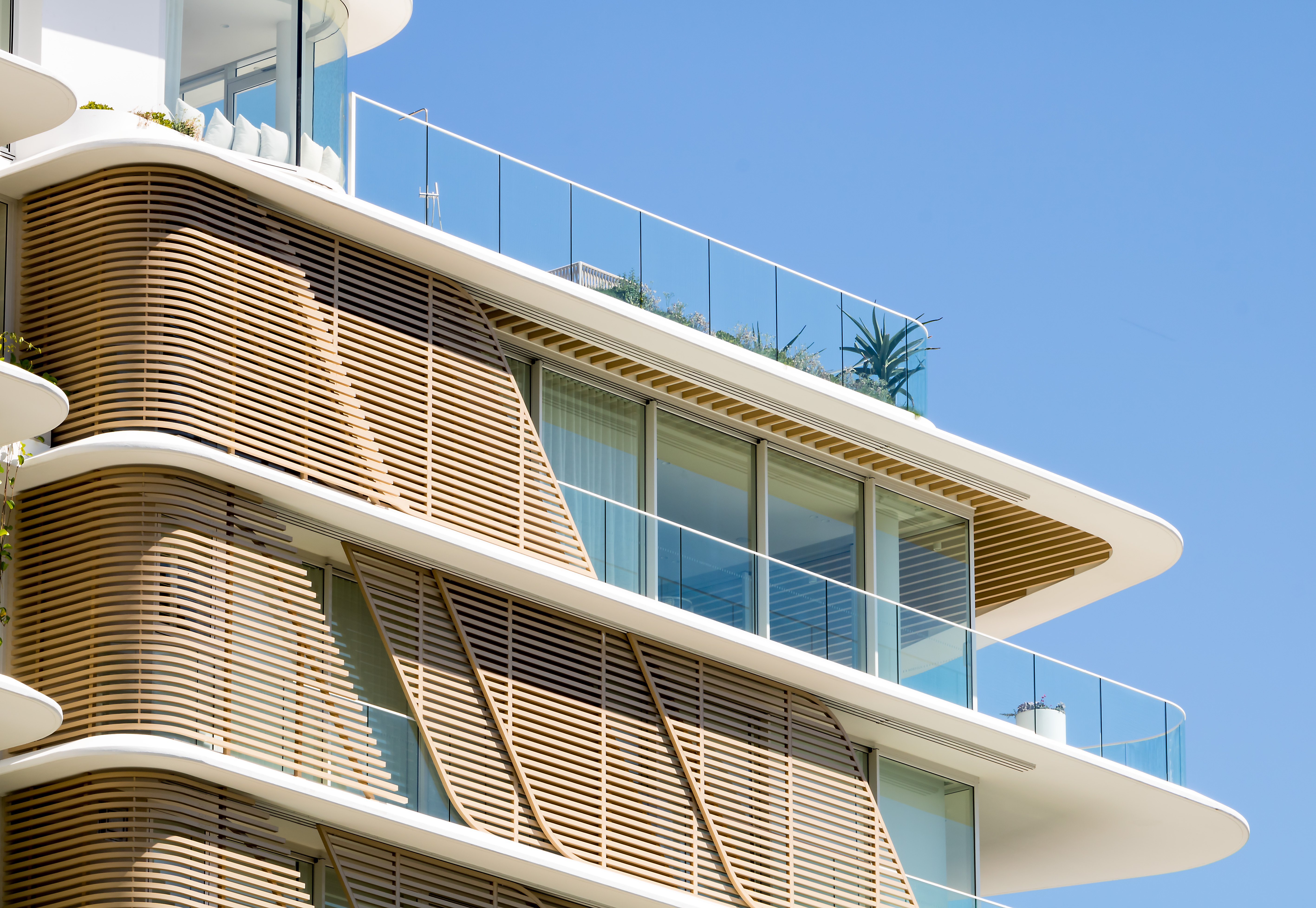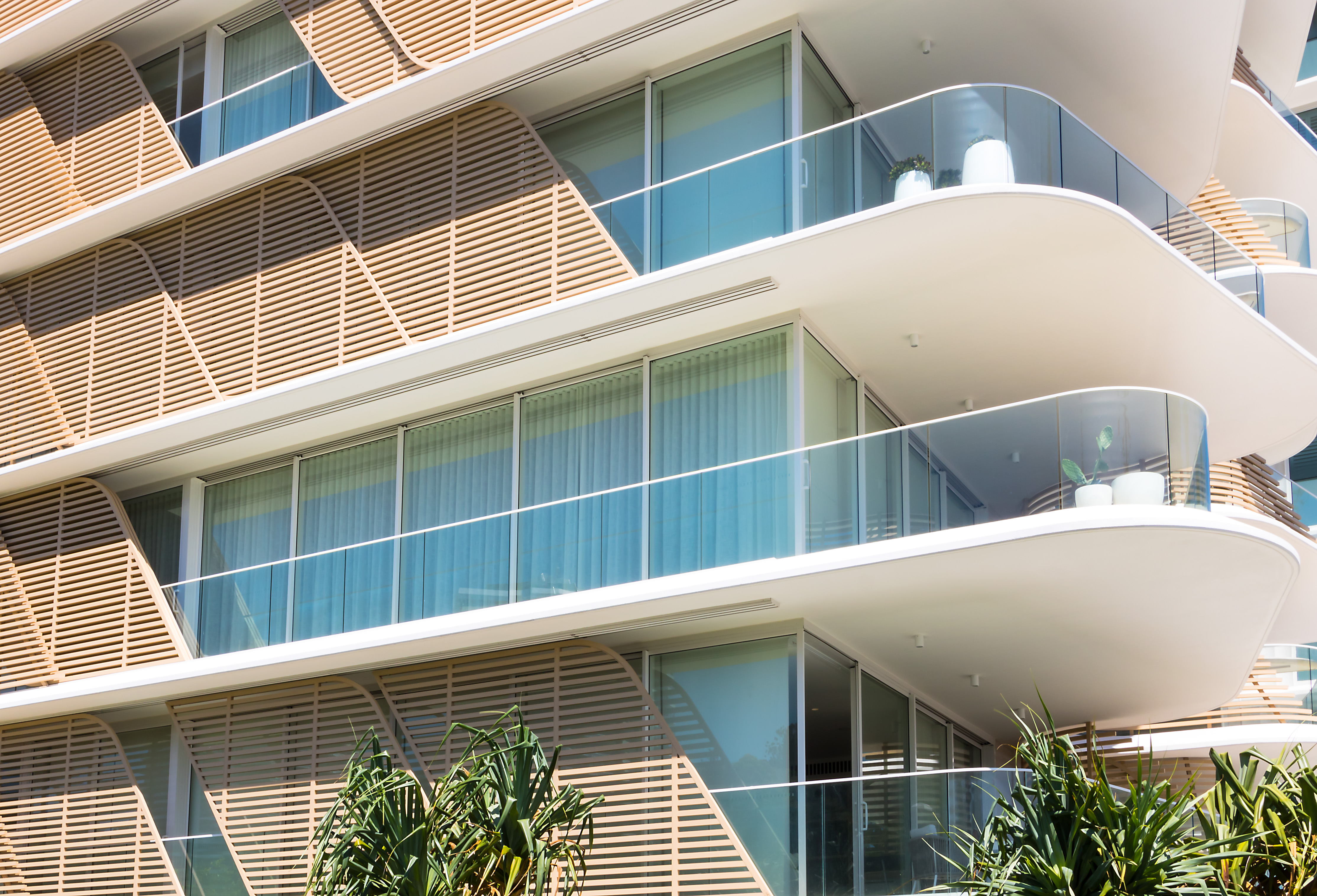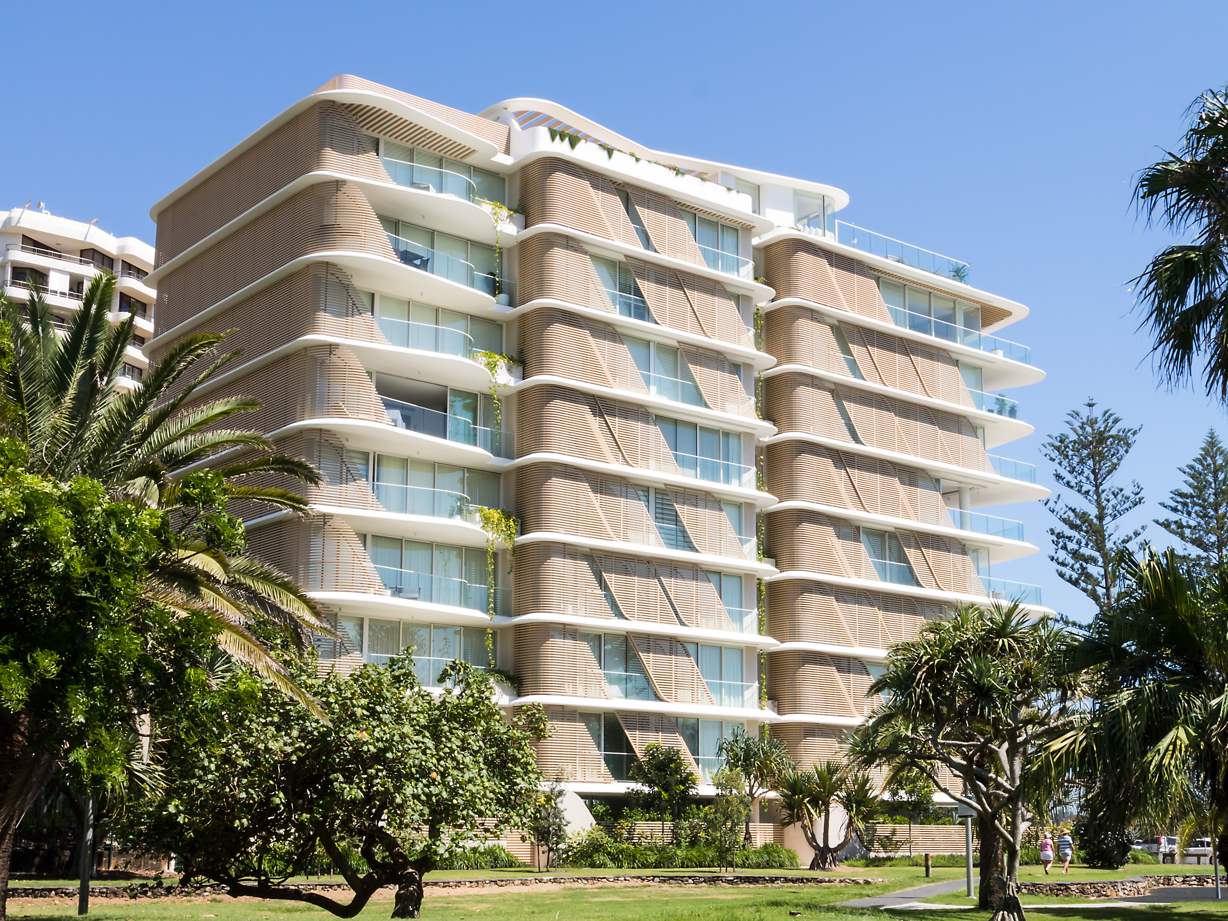 A combination of curved timber panelling and pearl-finished window framing creates a soft, natural appearance for this new beachside apartment complex. Located on Queensland’s Gold Coast, the Norfolk apartments have been designed to sit comfortably in the seaside environment.