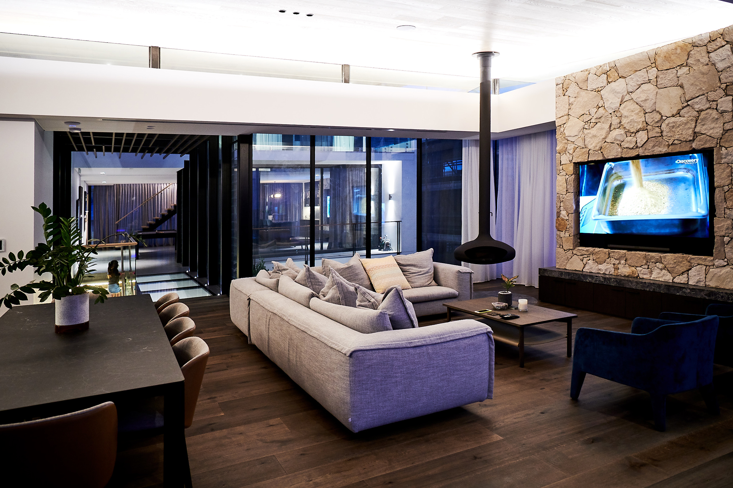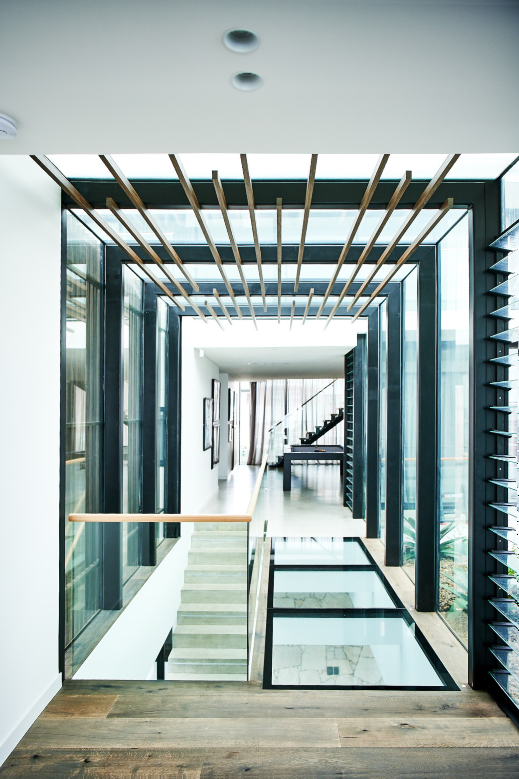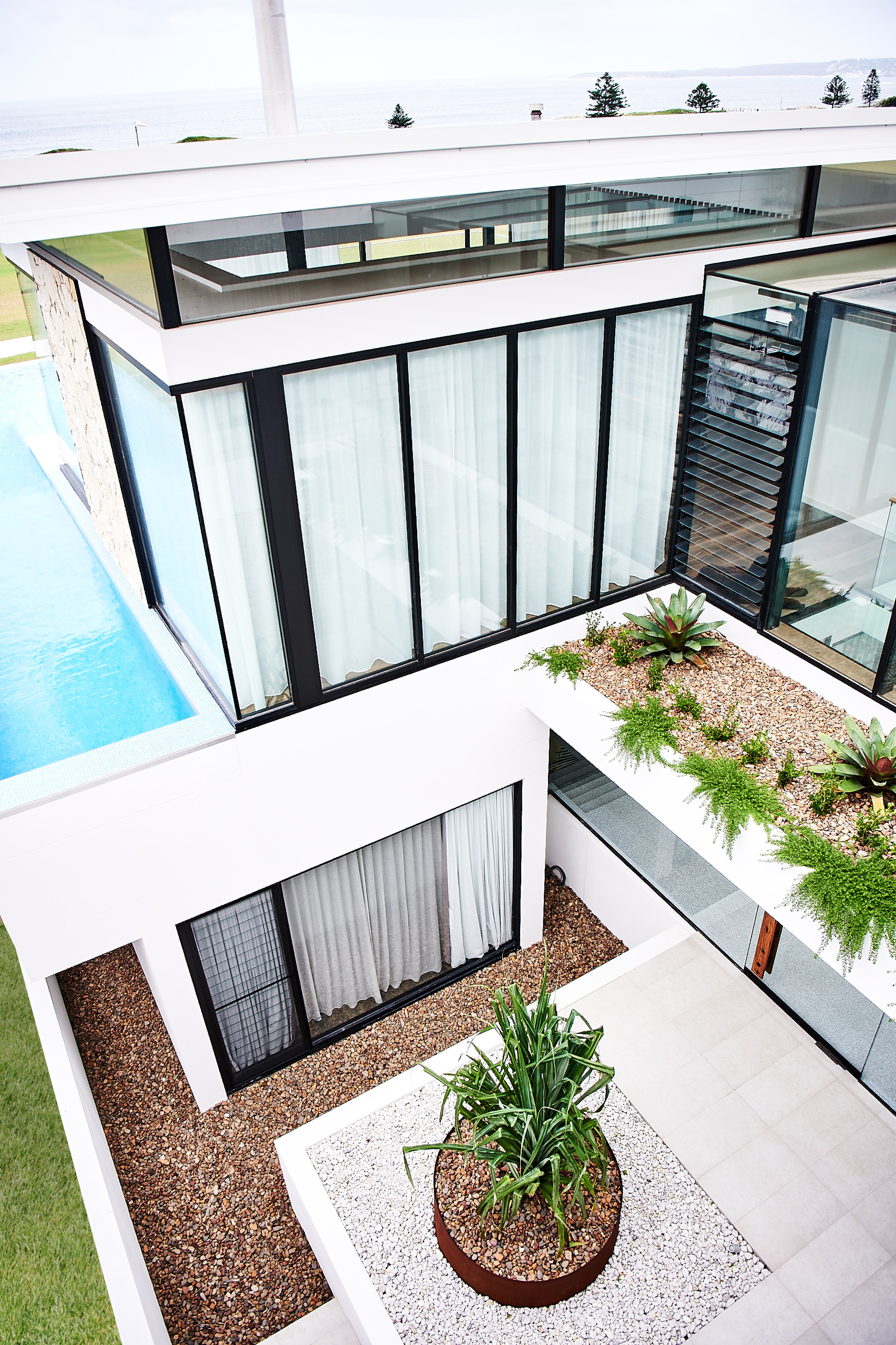 The three-level home has been designed around spacious internal areas enclosed by floor-to-ceiling glass and inviting outdoor areas orientated to capitalise on the ocean views. With the sunny aspect and energy efficiency in mind, Alspec’s McArthur Evo framing and ecoFRAMEplus double glazed framing were used in the construction of the key building facades. While both are centre pocket framing systems, the ecoFRAMEplus has additional energy efficiency credentials which will contribute to the building’s performance under weather extremes, providing a comfortable interior in all seasons. A light filled walkway, designed with glass panels overhead and below, joins the front and rear sections of the home and works to ensure natural light reaches every room.