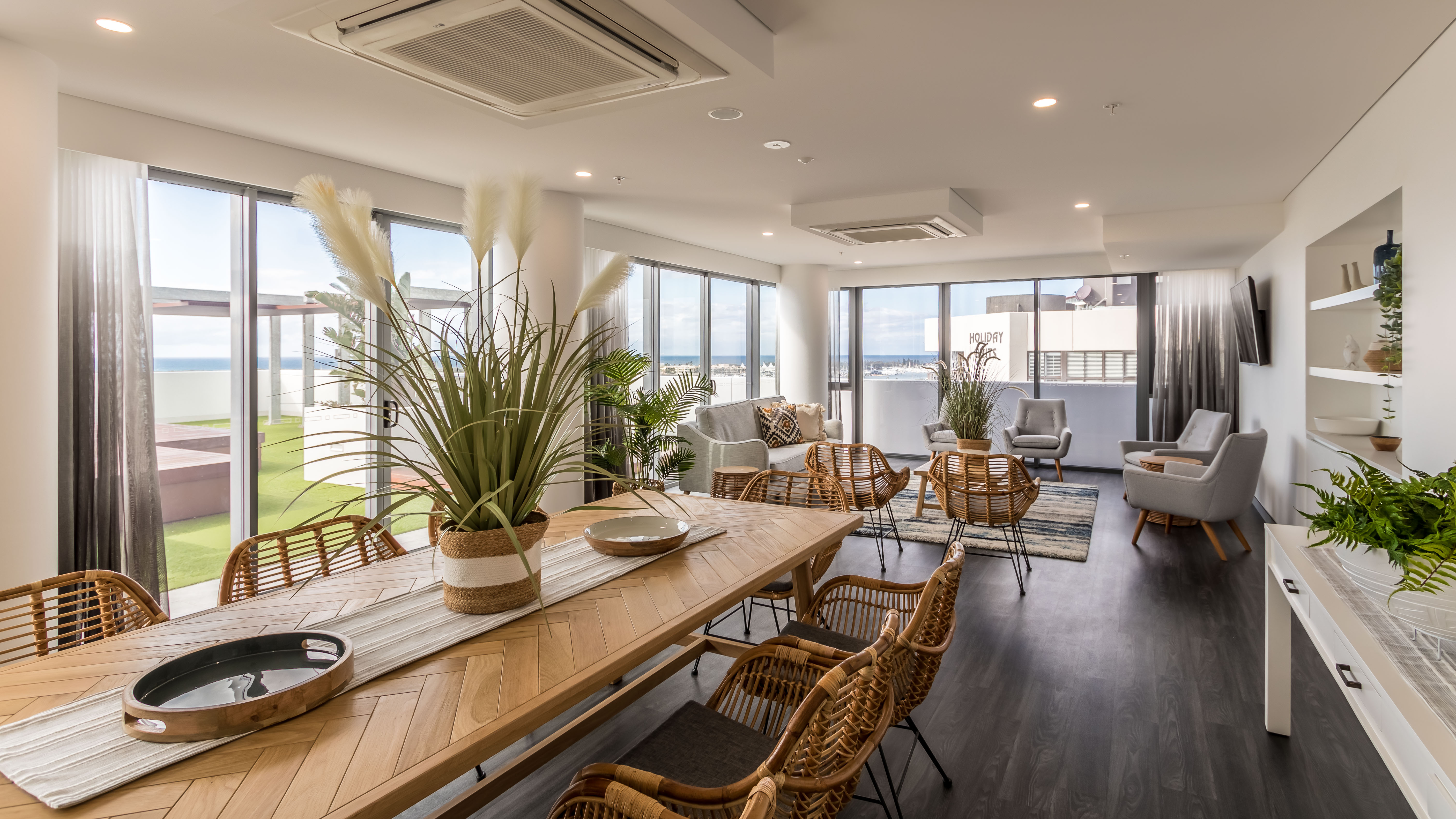 Fixed framing needs were drawn from the Hunter Evo and McArthur Evo aluminium framing ranges. The Hunter Evo framing is a flush glazed system which creates a sharp, unbroken lines profile, while the McArthur Evo is a centre pocket system which also has contemporary appeal. Both framing systems are acoustic and cyclonic compliant, desirable credentials for this type of development and location.