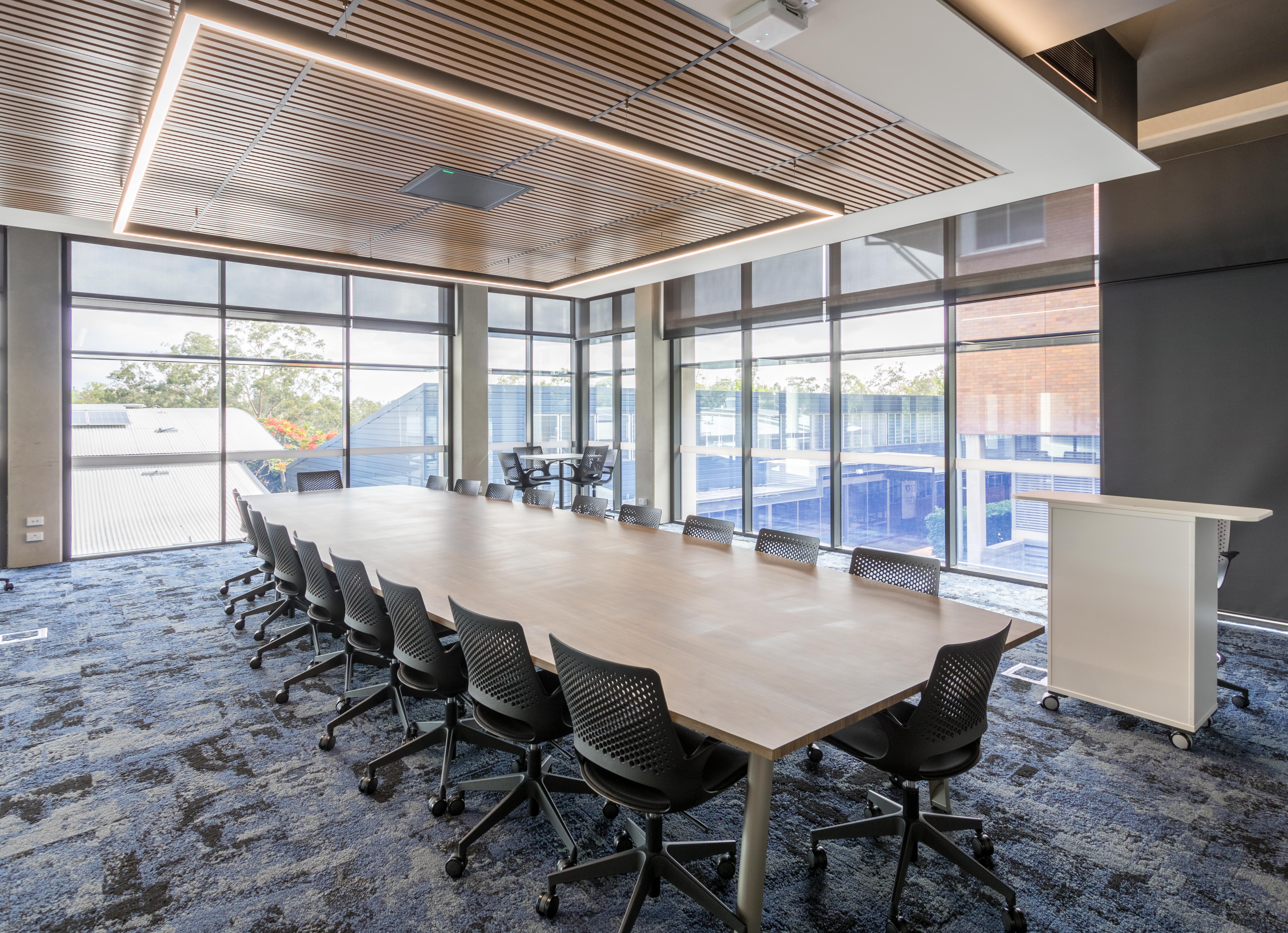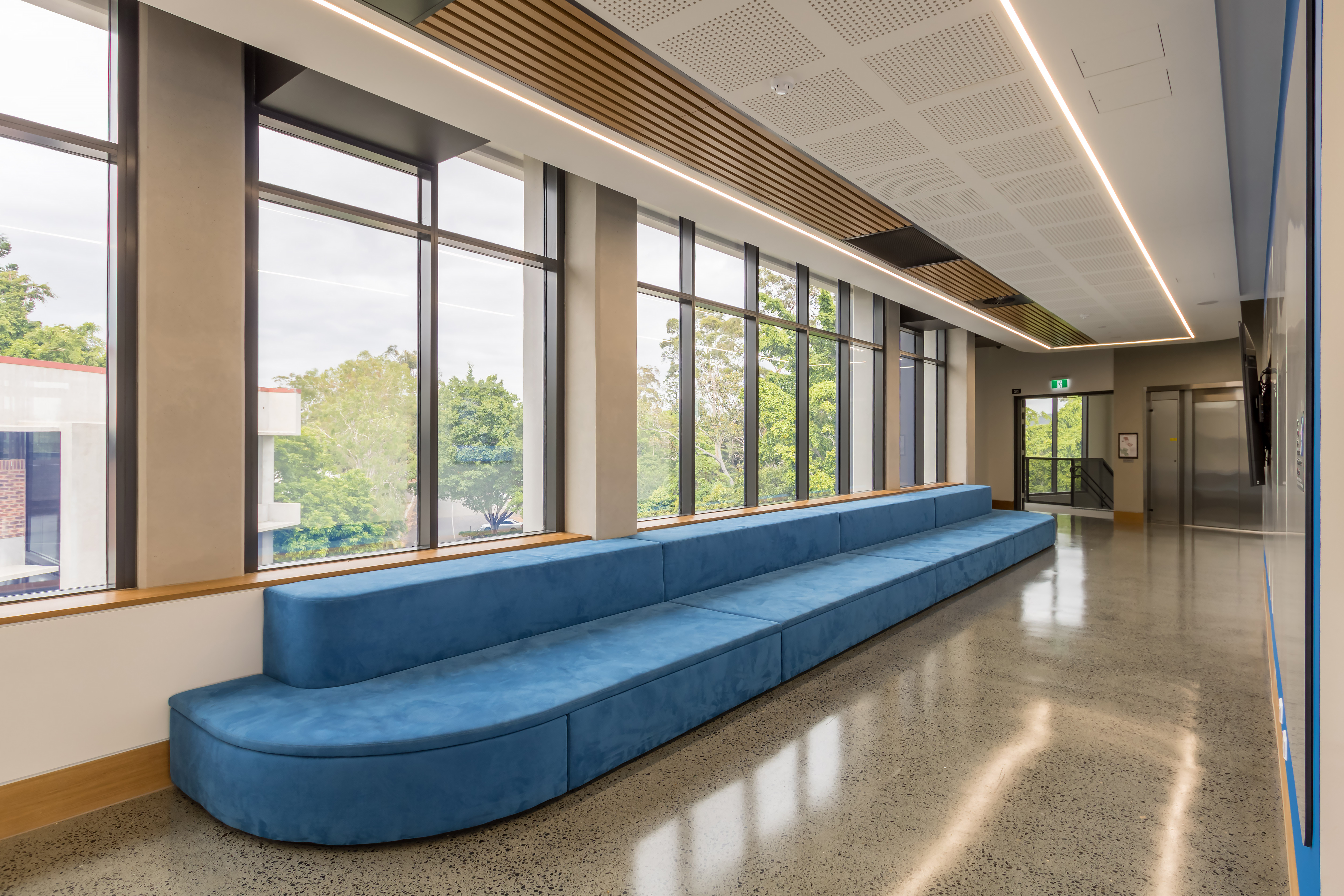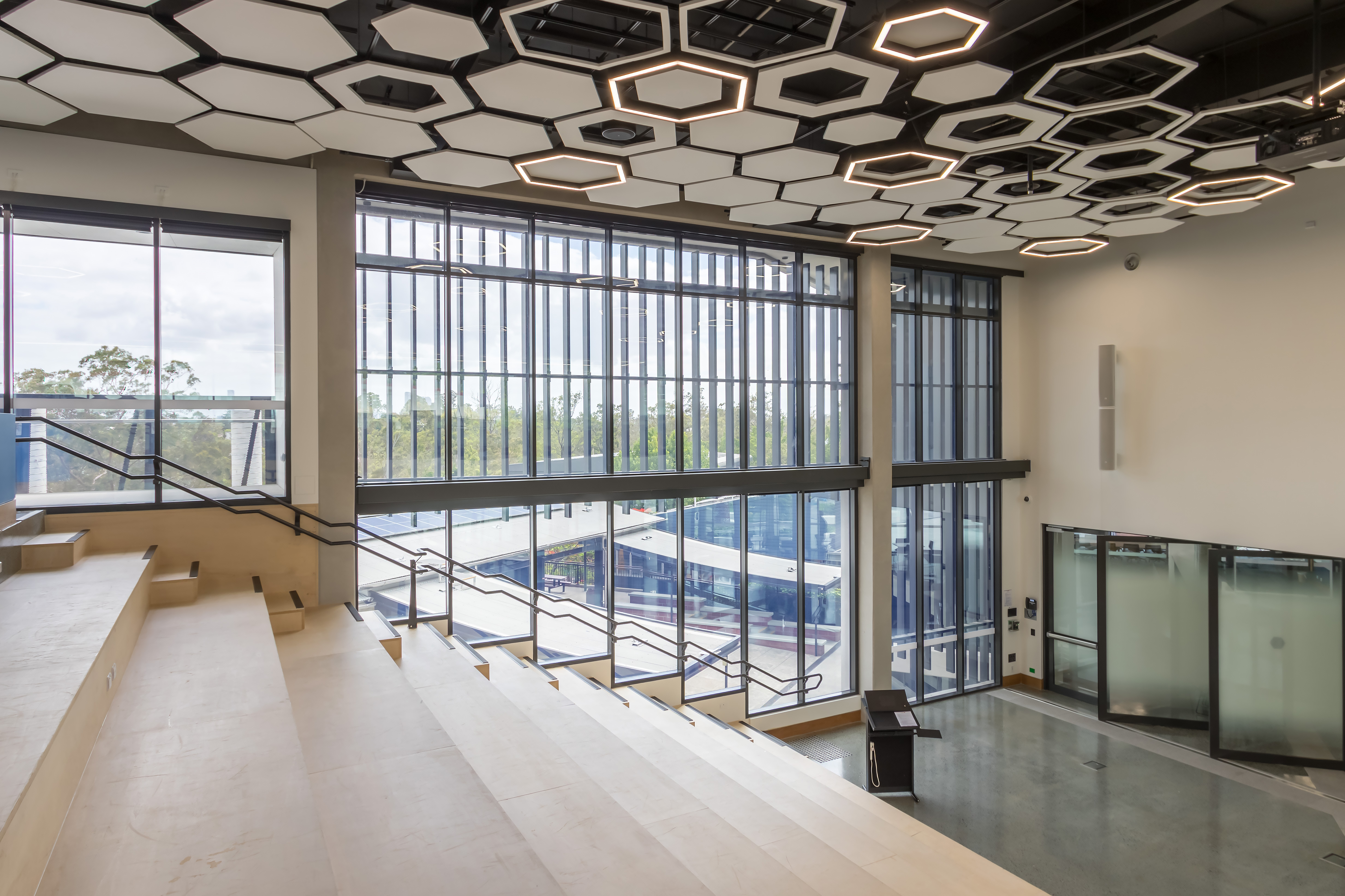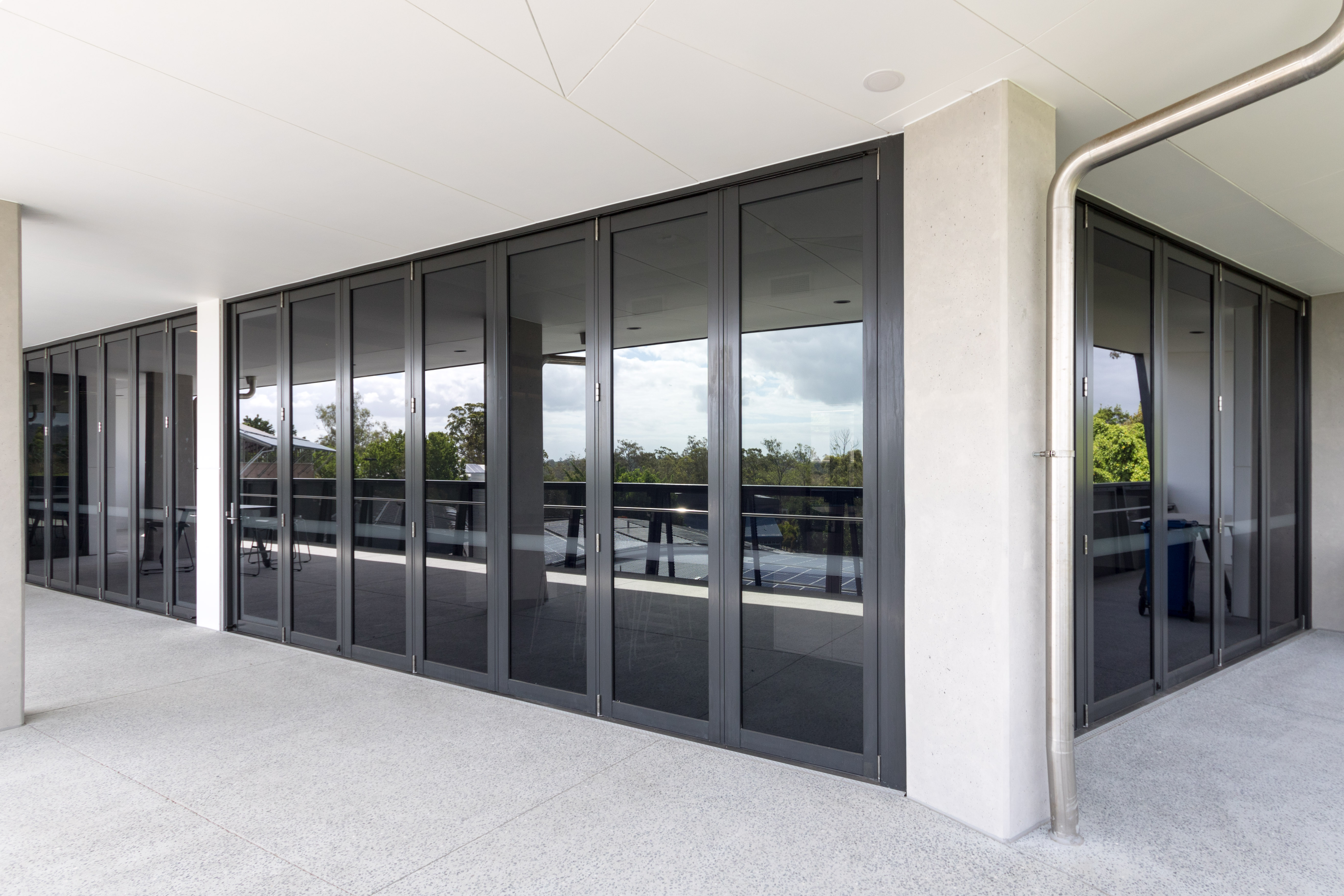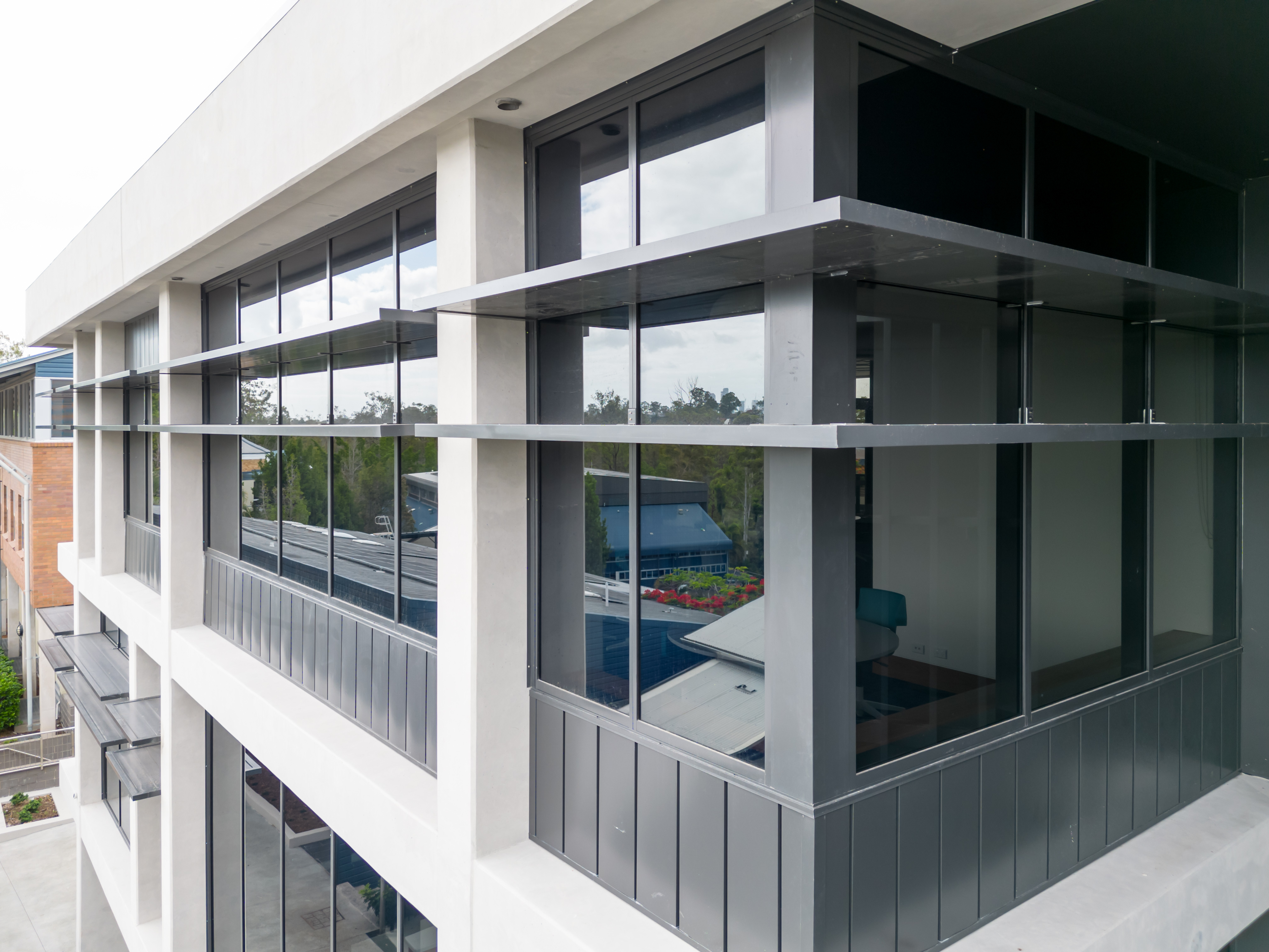 Local fabricator, Fitout Glass, was called into the CLI to install full-height glazing with an integrated sun hood and oversized center-pivot doors in one of the teaching areas.