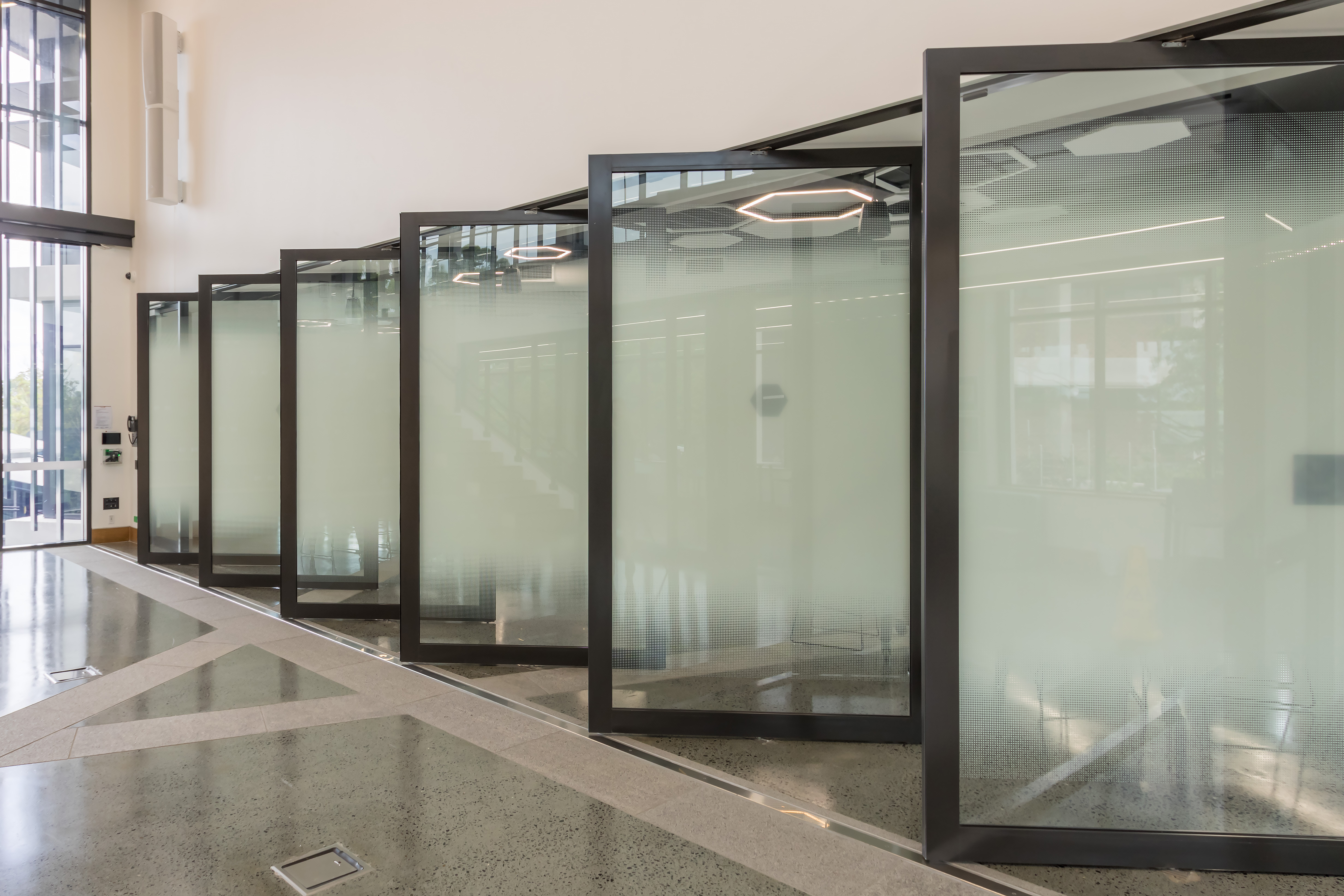 Unfortunately, the door’s width was outside the product specifications. In consultation with the construction management team, Fitout Glass devised a clever solution by custom engineering the door in their factory and introducing tie rods to prevent the door from sagging.